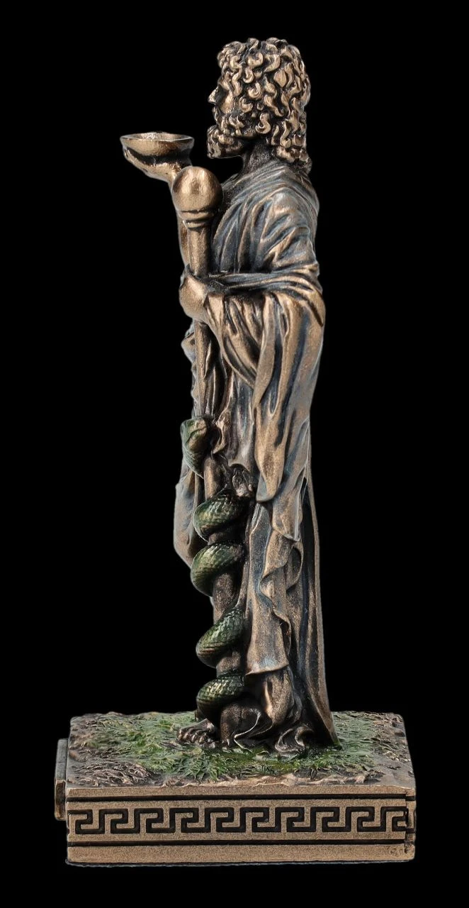 Auch im Alten Rom wurde Äskulap, der altgriechische Gott der Heilkunst, verehrt und bis heute ist der mit Stab und Äskulapnbatter dargestellte Gott ein Symbol der Heilkunde. Die kleine, aber wunderbar detailreich aus edel bronziertem und zurückhaltend coloriertem Kunststein (Polyresin) gefertigte Äskulap-Figur von Veronese hält in einer Hand eine Schale und mit der anderen Hand den Äskulap-Stab. Die kleine Skulptur ist 9 cm hoch, 4 cm breit und 4 cm tief. Der Gott der Heilkunst ist eine schöne kleine Dekoration für eine Apotheke oder einen Arzt und damit auch ein perfektes Geschenk.