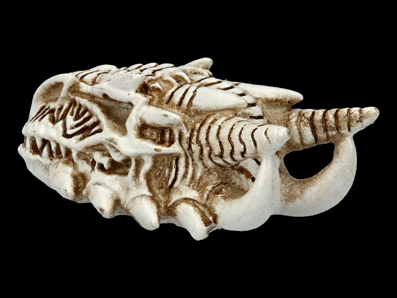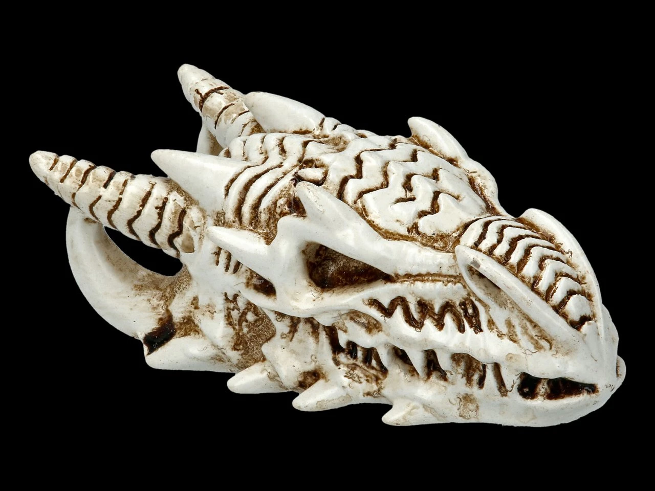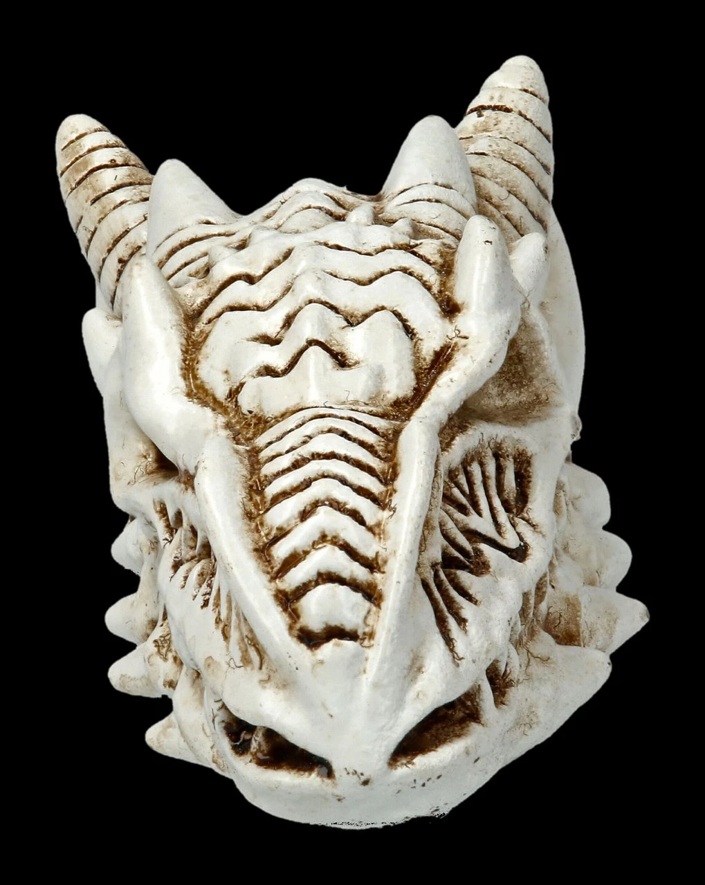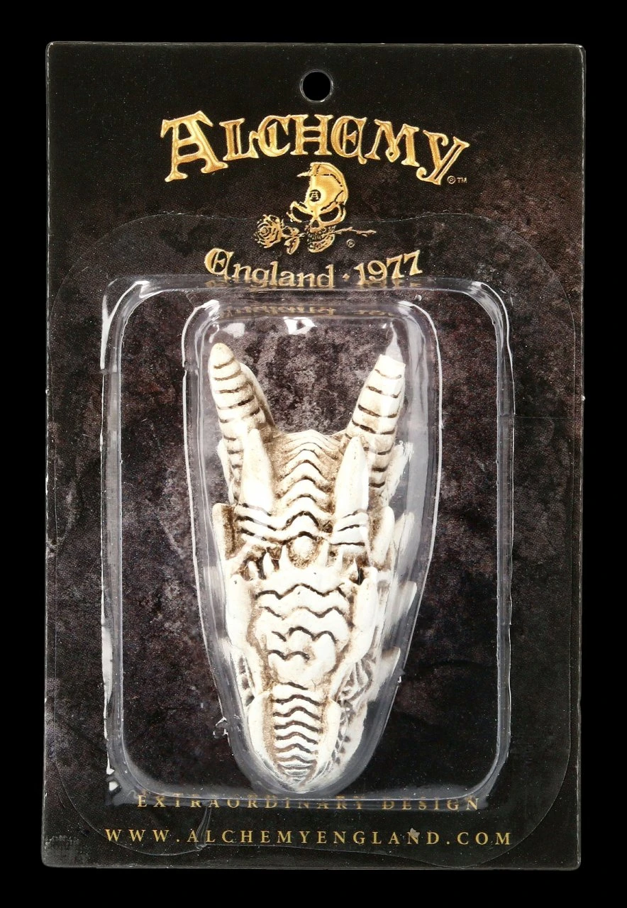Außerordentlich detailreich und wie ein richtiges Urzeit-Fossil ist der kleine Drachen-Schädel aus handbemaltem Kunststein (Polyresin) gefertigt. Der kleine Drachen-Totenschädel von Alchemy England ist 2 cm hoch, 2,5 cm breit und 5,5 cm tief.