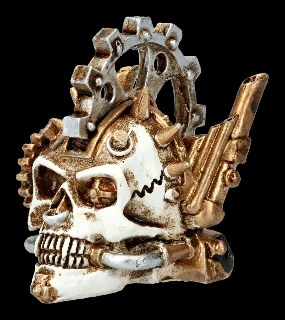 Obwohl er nur eine Höhe von 4 cm, eine Breite von 3 cm und eine Tiefe von 4 cm hat, ist dieser kleine Steamhead-Totenkopf von Alchemy England mit zahlreichen detailliert dargestellten technischen Accessoires versehen. Der kleine Totenschädel im Steampunk-Design ist detailreich aus handbemaltem Kunststein (Polyresin) gefertigt und ein tolles Geschenk für Steampunk-Fans.