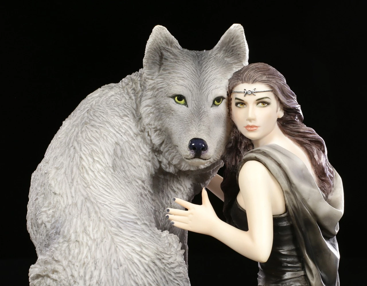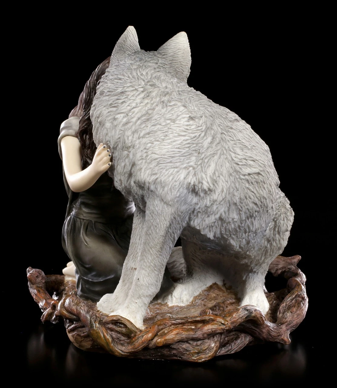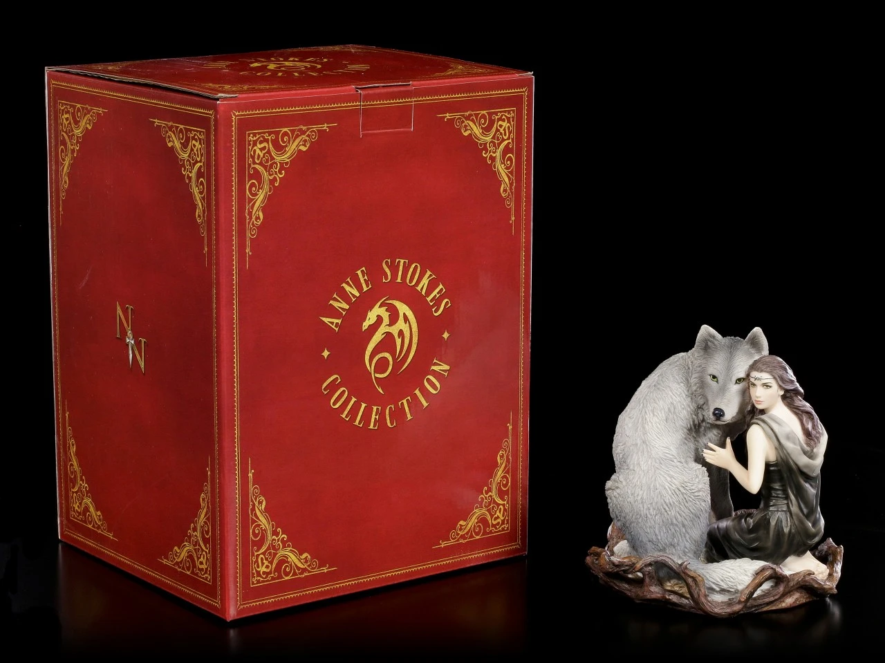 Die geheimnisvolle Dame schmiegt sich vertrauensvoll an ihrem Seelenverwandten, einen majestätischen Wolf. Die bekannte Künstlerin Anne Stokes schuf diese wunderschöne Figurenkomposition. Ein Zeichen für die innige Freundschaft die zwischen Mensch und Tier bestehen kann. Die Wolf Figur ‚Soul Bond‘ wurde aus hochwertigem Kunststein bis ins kleinste Detail ausgearbeitet und liebevoll handbemalt. Sie kommt in einer schönen Geschenkbox.