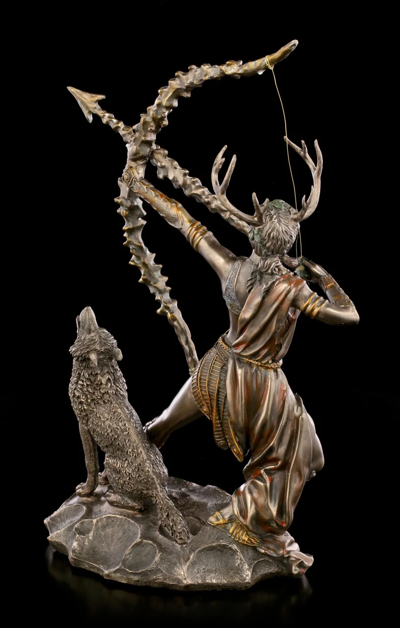 Eine der 12 wichtigsten Götter der griechischen Mythologie ist Artemis. Sie ist die Göttin der Jagd, des Waldes, des Mondes und sie ist die Hüterin der Kinder und Frauen. In der römischen Mythologie wird die Göttin Artemis Diana genannt. Artemis ist die Zwillingsschwester von Apollo. Die bronzierte und colorierte Kunststein Figur der Artemis stellt sie beim Bogenschießen in Begleitung eines Wolfes dar.