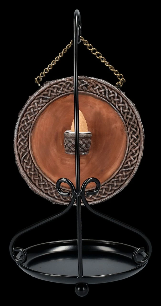 Aus den Wurzeln, dem Stamm und der Krone eines uralten Baumes blickt das Gesicht des Baumgeistes auf den Betrachter. Auf der Rückseite der Scheibe aus handbemaltem Kunststein (Polyresin) mit dem Durchmesser von 12 cm befindet sich die Halterung für den Backflow-Räucherkegel. Die Scheibe kann an dem mitgelieferten schwarzen Metallständer aufgehängt werden. Der Backflow Räucherhalter mit dem Greenman ist insgesamt 25 cm hoch, 13 cm breit und 12,5 cm tief. Wenn der Räucherkegel hinter der Scheibe brennt, scheint der Greenman Baumgeist heißen Atem auszustoßen, der dann in die Metallschale fließt. 3 Backflow-Räucherkegel werden mitgeliefert und weitere gibt es in großer Auswahl in unserem Shop. Bitte beachten Sie unsere Sicherheitshinweise zur Nutzung der Backflow-Räucherkegel. Der Baumgeist als Backflow Räucherhalter ist auch ein fantasievolles Geschenk.