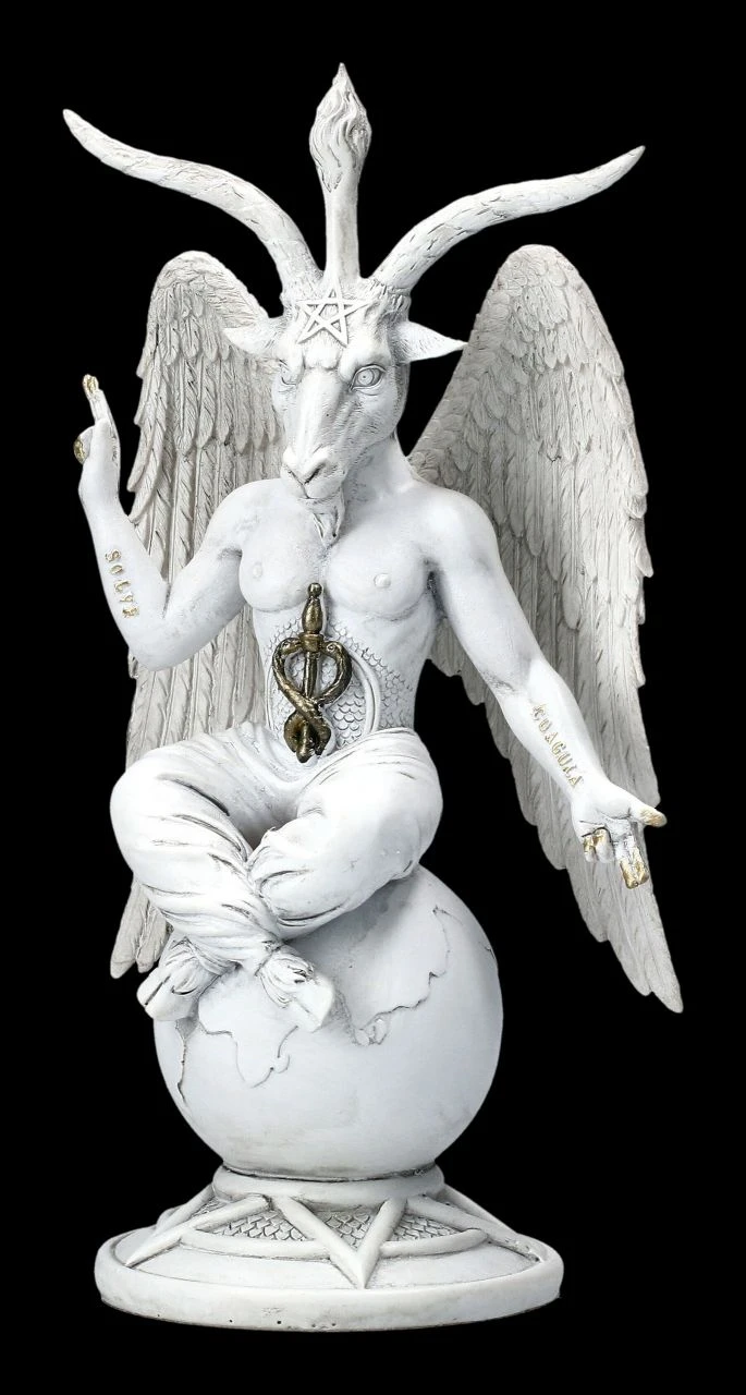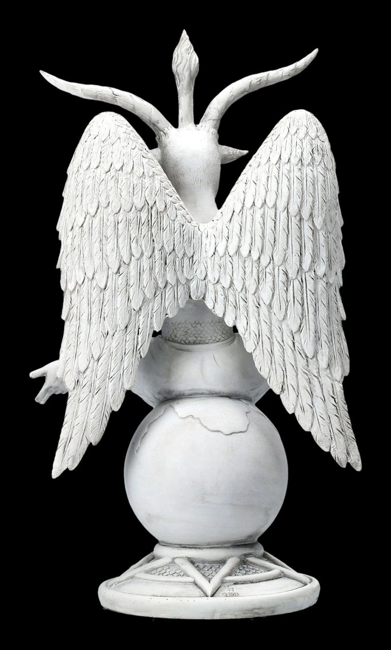 Einer Darstellung aus dem 19. Jhdt. nachempfunden ist diese schöne Baphomet Figur mit dem Ziegenkopf und den gegensätzlichen Attributen, wie gut und böse, halb Tier-halb Mensch, männlich-weiblich, Ganz in weiß und mit großen Engelsflügeln sitzt The Dark Lord auf einer Weltkugel, die wiederum auf einer runden Platte mit Pentagramm ruht. Allerdings schmückt sich Baphomet mit goldenen Akzenten, wie dem Dolch mit den beiden Schlangen am Bauch und den lateinischen Wörtern ‚SOLVE‘ (auflösen) am rechten, nach oben zeigenden Arm und ‚COAGULA‘ am linken, nach unten zeigenden Arm. Die Baphomet Figur wirkt in der weiß-goldenen Farbgebung sehr edel. Sie ist sehr fein aus Kunststein (Polyresin) gefertigt und sorgfältig handbemalt. Die Figur hat eine Höhe von 26 cm, eine Breite von 15 cm und eine Tiefe von 10 cm und wird mit Sicherheit alle Blicke magisch auf sich ziehen.