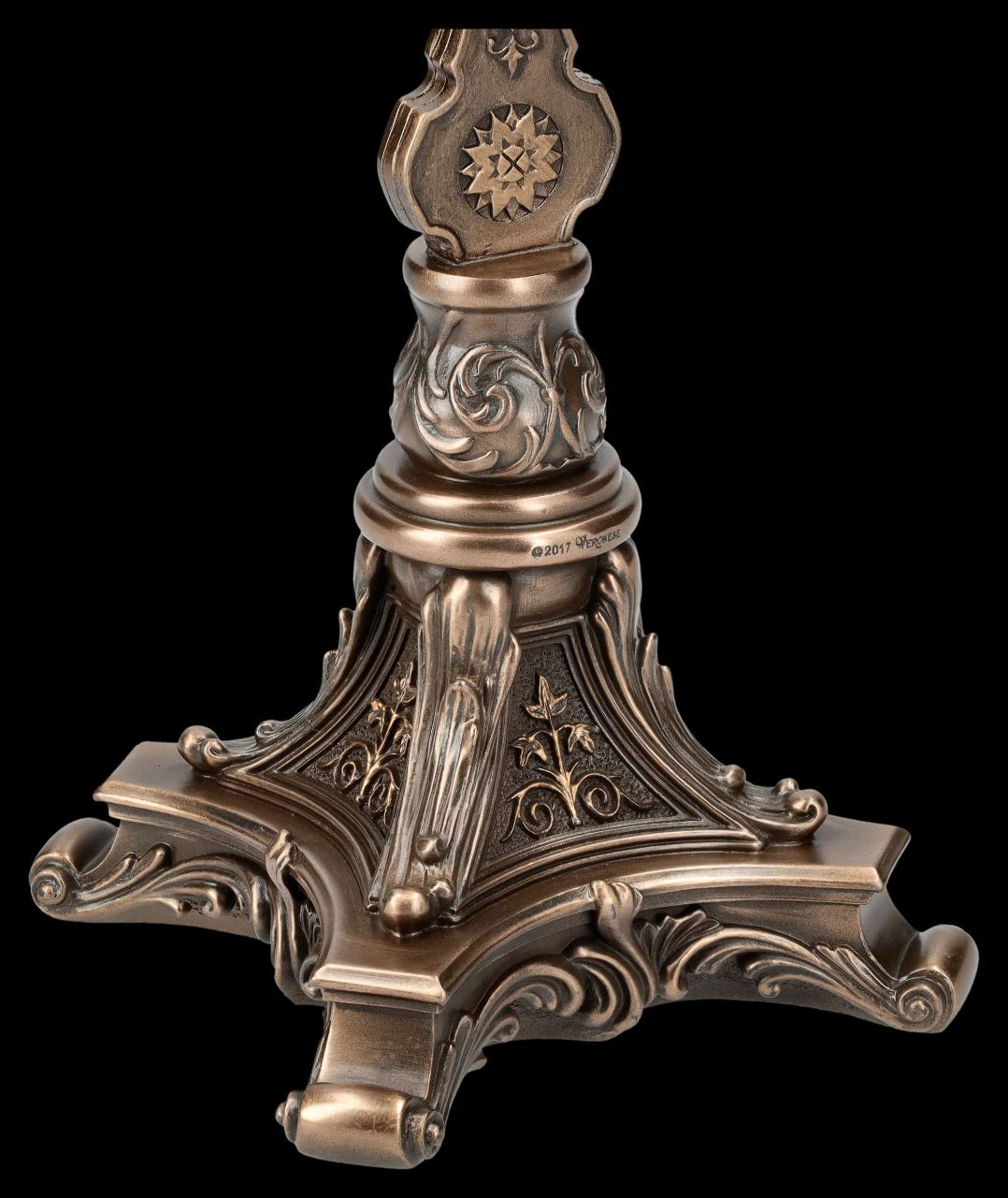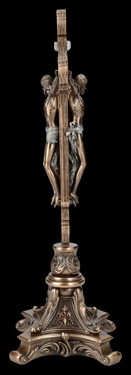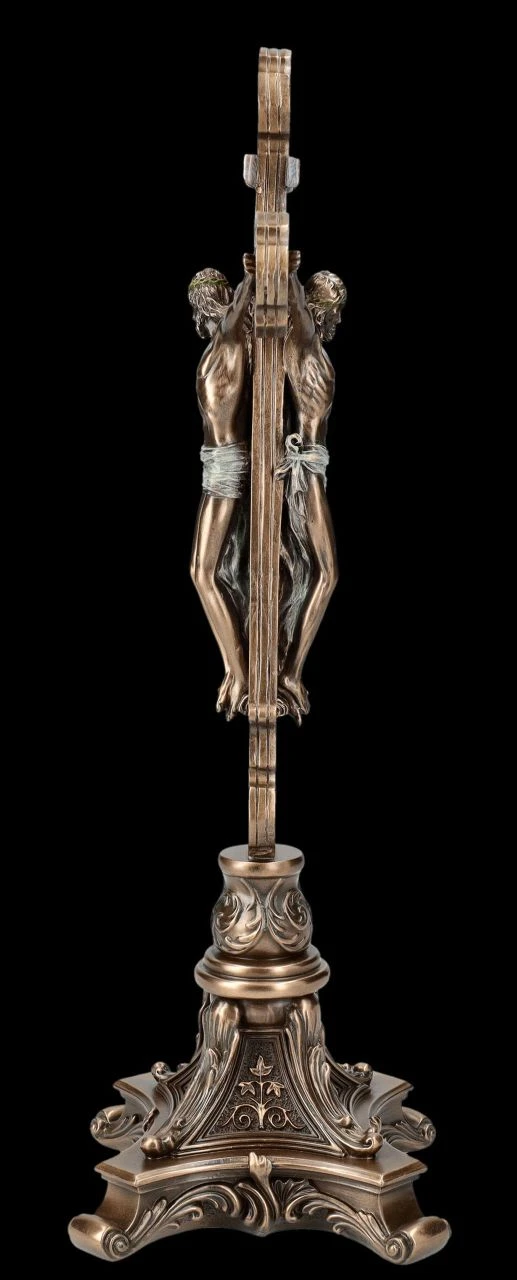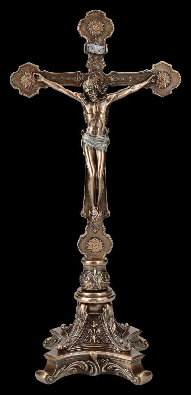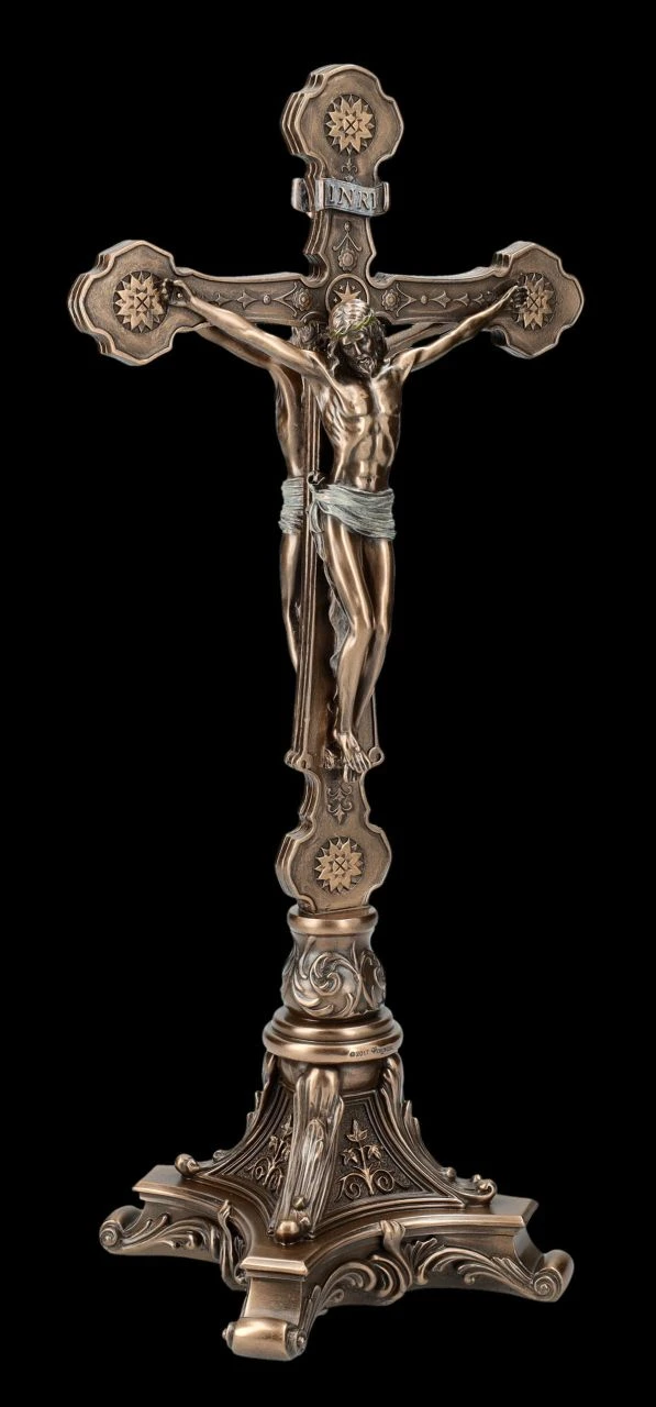 Ob als Tischaufsatz oder auf einem Altar – dieses wunderschöne und durch die hochwertige Machart sehr edle Tisch-Kruzifix mit Jesus am Kreuz wird überall zum sofortigen Blickfang. Es kann frei aufgestellt werden, da es beidseitig betrachtet werden kann. Seine Silhouette wird so raffiniert inszeniert, denn dadurch hat das Kreuz eine effektvolle dreidimensionale Ausstrahlung. Das Tisch-Kruzifix von Veronese ist in seiner barocken Pracht sehr detailreich aus hochwertigem Kunststein (Polyresin) gefertigt. Es wirkt durch die Bronzierung und feine und zurückhaltende Colorierung ausgesprochen edel. Für Gläubige ist das prachtvolle, 32 cm hohe, 15 cm breite und 10,5 cm tiefe Jesus-Kruzifix auch ein wunderbares Geschenk.