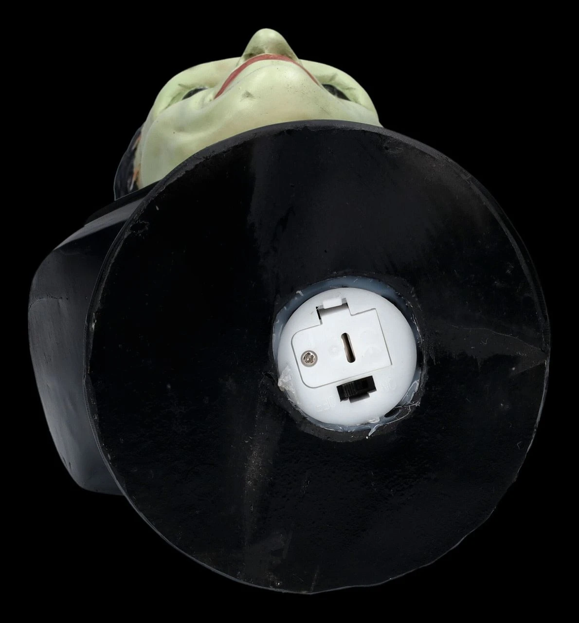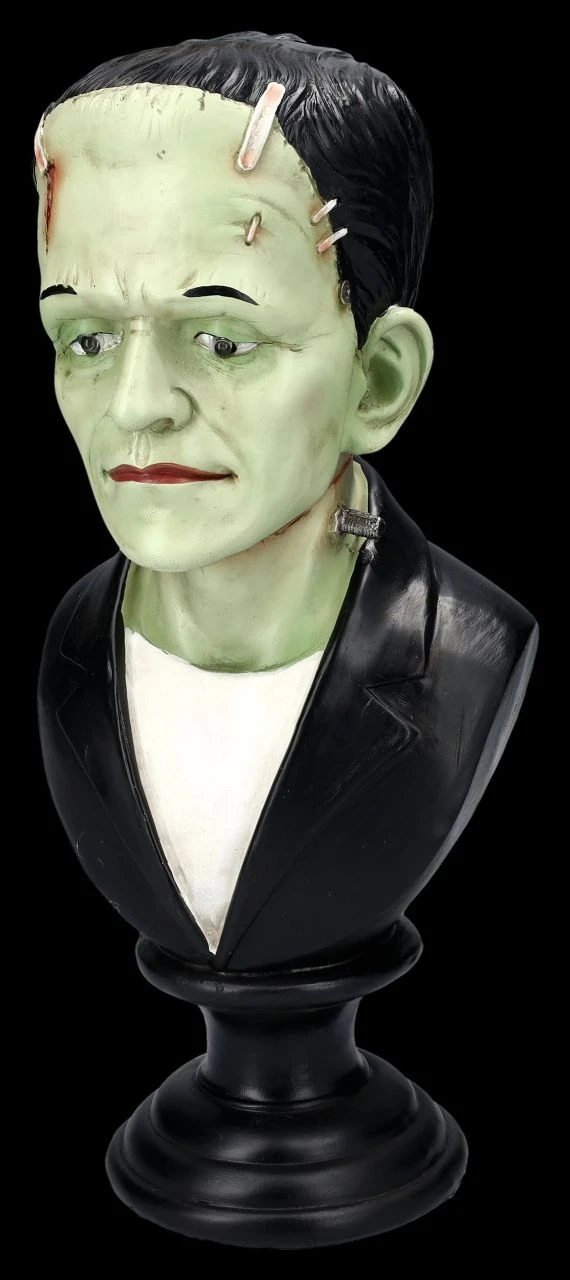 Frankensteins Monster ist unglücklich und deprimiert und das sieht man dieser detailreich aus handbemaltem Kunststein (Polyresin) gefertigten Skulptur auch an. Aber nicht nur das – durch die batteriebetriebene LED-Beleuchtung ist nicht nur das Gesicht grün, sondern im Dunkeln leuchten auch noch die Augen grün. Die 35 cm hohe, 16 cm breite und 12,5 cm tiefe Skulptur mit dem Kopf von Frankensteins Monster ist eine wirklich ungewöhnliche Deko, bei der es viel zu schade ist, wenn sie nur an Halloween aufgestellt wird. Für die LED-Beleuchtung werden 2 x LR44 Batterien benötigt, die nicht in der Lieferung enthalten sind.