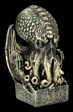 Die bronzefarbene Cthulhu Büste wurde aus handbemaltem Kunststein geschaffen. Die Büste zeigt den großen Alten Cthulhu in seiner Oktopus-ähnlichen Form. Sein Kopf ist wie ein Oktopus geformt. Mit seiner verlängerten Stirn und den vielen Tentakeln, die ihm aus seinem zornigen Gesicht wachsen. Allerdings hat er auch ein leicht menschliches Aussehen durch seine Arme und Beine, die aber mit spitzen Krallen versehen sind. Als ob der große Alte nicht schon erschreckend genug wäre, trägt er auch zwei knöchrige Flügel an seinem Rücken. Der Cthulhu hockt auf einem mit Runen verzierten Sockel und hält in einer seiner Tentakel einen Schlüssel. Er wartet in Ruhe auf seine Zeit, wo er wieder auferstehen wird um den Schrecken erneut über die Welt zu bringen.