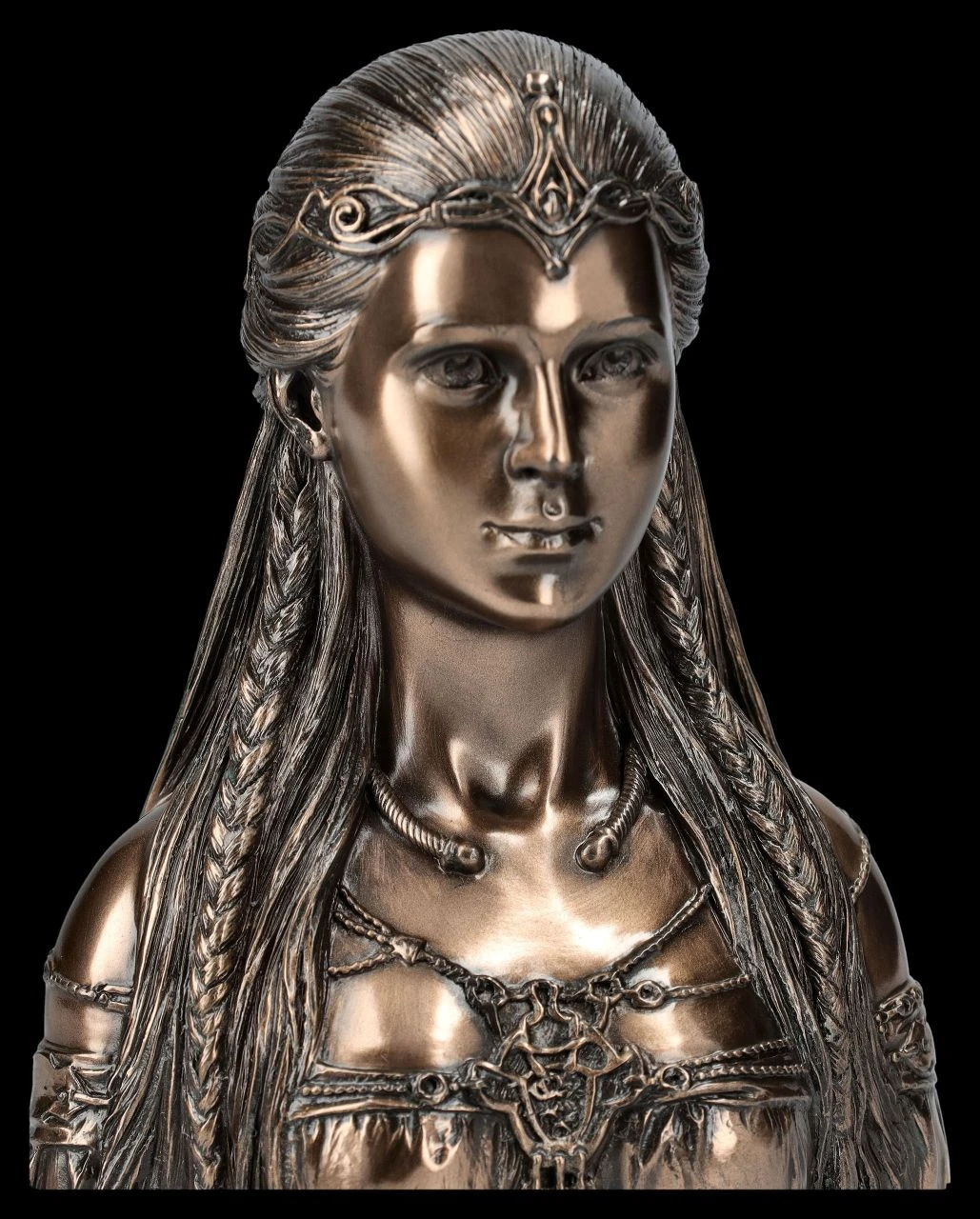 Die wunderschöne Büste aus der Studio Collection von Veronese zeigt Danu,die Muttergöttin aus der keltischen Mythologie Irlands. Sie gilt als Mutter des irischen Clans der Gottheiten ‚Tuatha Dé Danann, also des Volkes der Göttin Danu und wird von vielen heute noch als Fluss- und als Erdgöttin verehrt. Die ästhetisch schöne Büste aus hochwertigem Kunststein (Polyresin) wirkt durch die sorgfältige Bronzierung besonders edel. Sie ist 18,5 cm hoch, 13 cm breit und 13 cm tief und außerordentlich dekorativ und effektvoll. Die elegante Silhouette dieser schönen Büste ist nicht nur ein edler Blickfang, sie ist auch ein ganz besonderes Geschenk für alle, die von den keltischen Mythologie und ihren Göttern fasziniert sind.