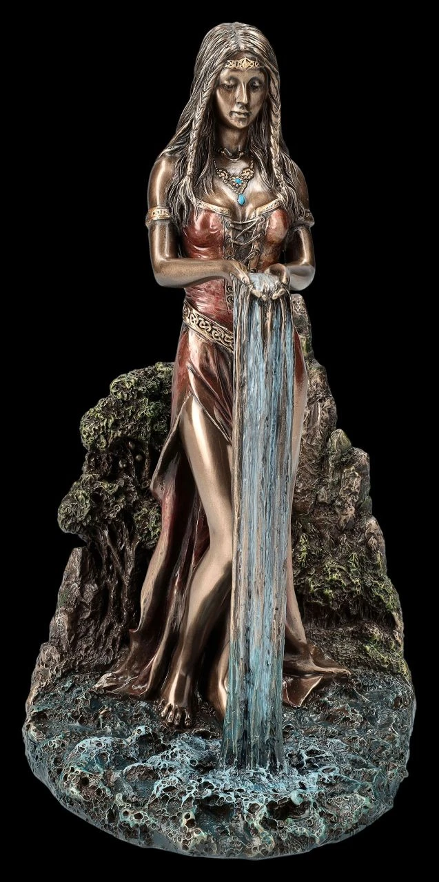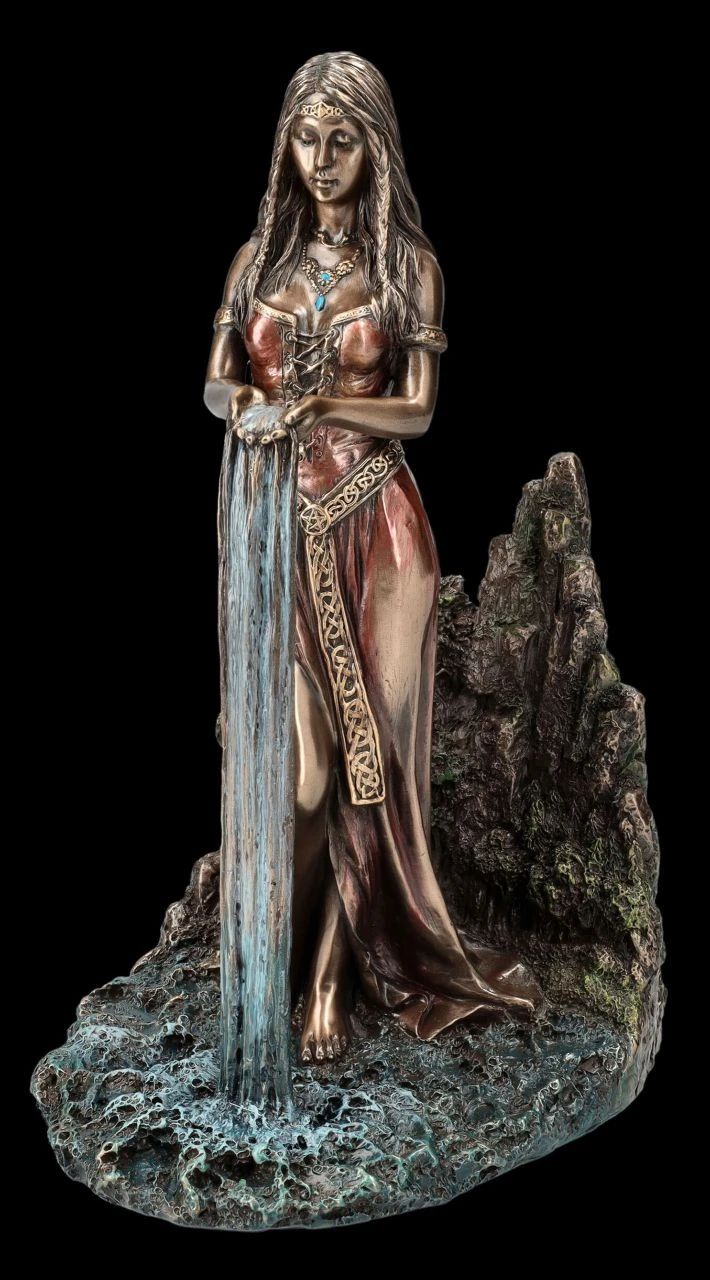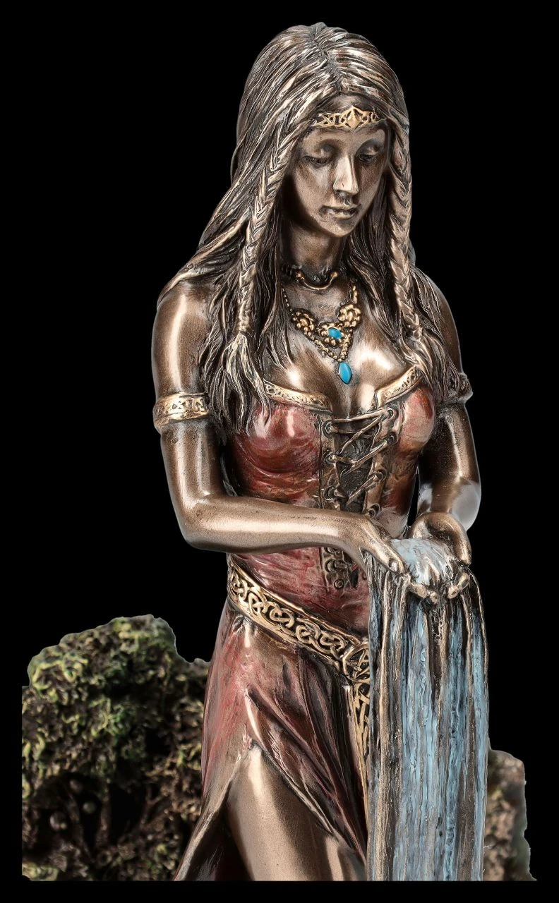 Die wunderschöne und sehr edle Darstellung aus der Studio Collection von Veronese zeigt die keltische Erdmutter Danu. In der keltischen Mythologie wird sie auch Dana genannt und auch mit der Muttergöttin Anu gleichgesetzt. Danu gilt als Mutter des Clans der irischen Gottheiten Tuatha Dé Danann, also des Volks der Göttin Danu, die aus vier mythischen Orten stammte. Unter anderem auch aus dem Gebiet der Donau, der sie den Mythen nach den Namen gegeben hat. Danu wird nicht nur als Erd- und Muttergöttin bezeichnet, sondern spendet auch als Flussgöttin Fruchtbarkeit und Nahrung. Bei dieser zauberhaften und sinnlichen Figur der Göttin Danu steht die Keltische Erdmutter vor einem Quellfluss, den sie mit ihren beiden Händen der Erde spendet. Die sehr elegante und edel bronzierte Danu-Figur wurde aus hochwertigem Kunststein (Polyresin) geschaffen und sehr fein coloriert. Sie ist 23 cm hoch, 12,5 cm breit und 15,5 cm tief und nicht nur für Freunde der keltischen Mythologie ein wunderbares Geschenk.