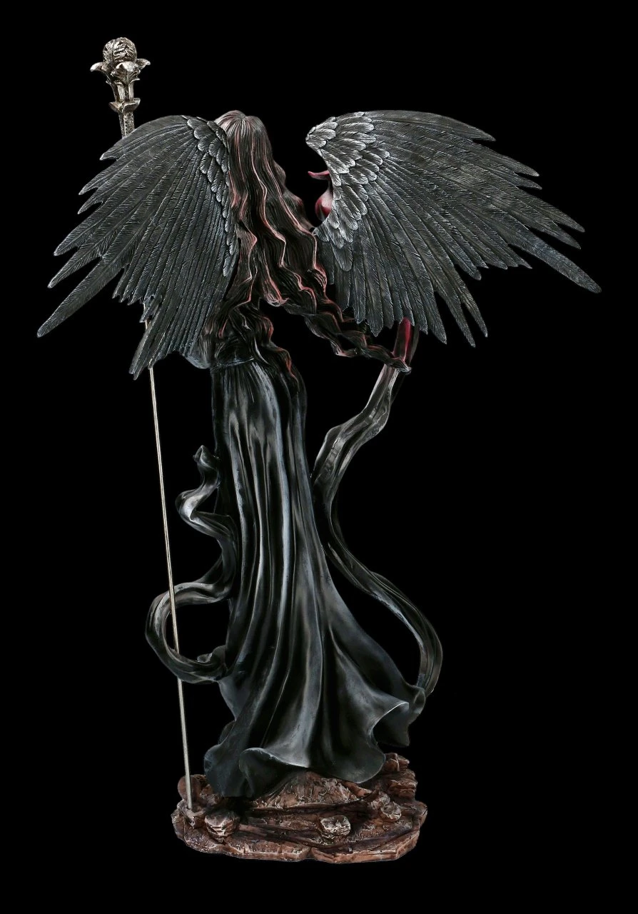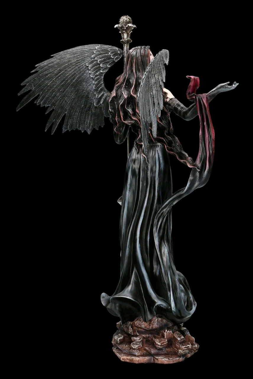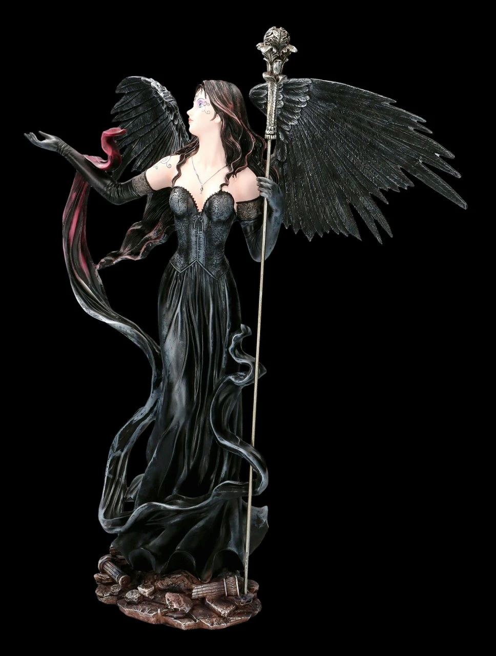 Der wunderschöne schwarze Engel Mysteria trägt ihren Namen völlig zu Recht. Das Zepter in der Hand des beeindruckend schönen dunklen Engels zeigt, dass sie gerne über jeden herrschen und bestimmen möchte. Der traumhaft schöne Engel Mysteria in dem langen schwarzen Miederkleid Kleid und mit den wunderschönen fliligranen Flügeln ist bis zu den Tatoos außerordentlich detailreich aus Kunststein (Polyresin) gefertigt und mit Liebe zum Detail handbemalt. Die herrlichen Flügel und auch das Zepter sind zum Stecken. Die prachtvolle Engelfigur ist 60 cm hoch, 43 cm breit und 22 cm tief. Eine wahrlich wunderbare Deko, die unbedingt da aufgestellt werden sollte, wo sie sofort entdeckt und bewundert werden kann.