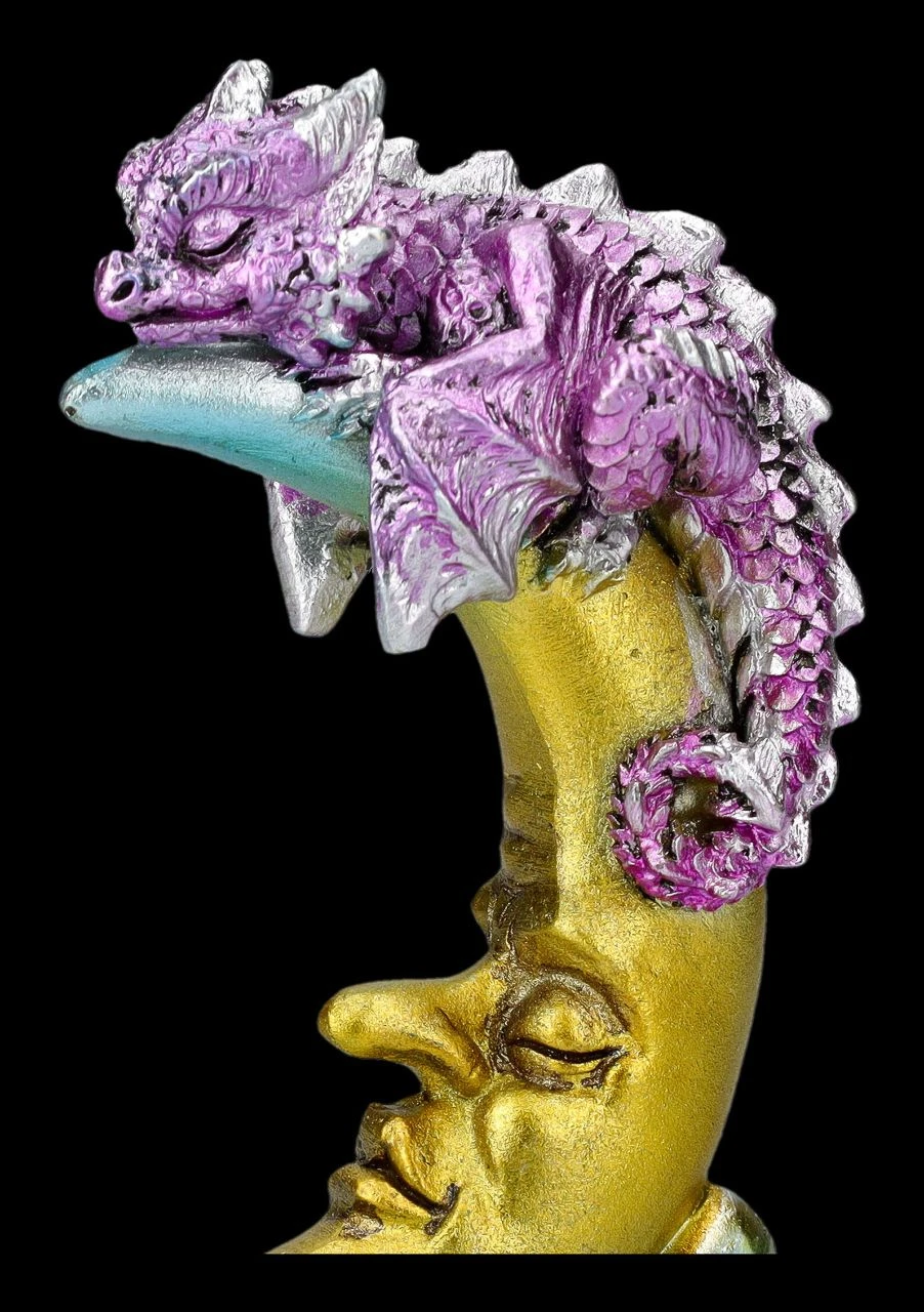La Li Lu, nur der Mann im Mond schaut zu…. Und schon ist das kleine Drachenbaby, das es bis zur Spitze der Mondsichel geschafft hat, eingeschlafen. Aber auch der Mond selbst schläft selig auf seinem Wolkenbett. Die niedliche Drachen-Figur mit dem kleinen schlafenden Drachen auf dem Mond ist 9 cm hoch, 7 cm breit und 4 cm tief. Sie ist aus liebevoll handbemaltem Kunststein (Polyresin) und nicht nur eine niedliche Deko für Sammler, sondern ein perfektes Geschenk für alle Drachen-Freunde..