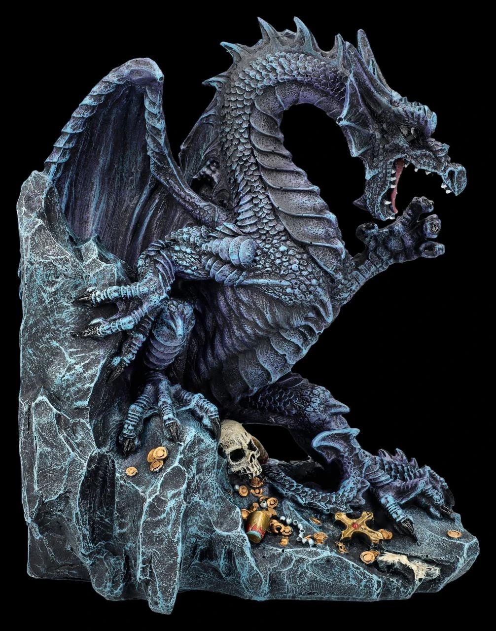 Diesem Drachen wird man mit Vorsicht begegnen. Fafnir, der legendäre Drache aus der nordischen Mythologie, taucht auch im ‚Ring der Nibelungen‘ als Fafner auf. Angriffslustig und mit weit aufgerissenem Maul verteidigt und bewacht der große Drache den Schatz zu seinen Füßen. Die 17 cm hohe, 14 cm breite und 11 cm tiefe Drachenskulptur ist detailreich aus Kunststein (Polyresin) gefertigt und wurde sorgfältig von Hand bemalt. Der legendenhafte Fafnir Drache ist eine fantastische Buchstütze für alle mystischen oder Fantasy Bücher im Bücherregal. Die beeindruckende Buchstütze ist also auch ein perfektes Geschenk für alle die Bücher lieben, oder auch eine fantasievolle Dekoration in einem Bücherladen. Unsere Dekoration ist nicht in der Lieferung enthalten.