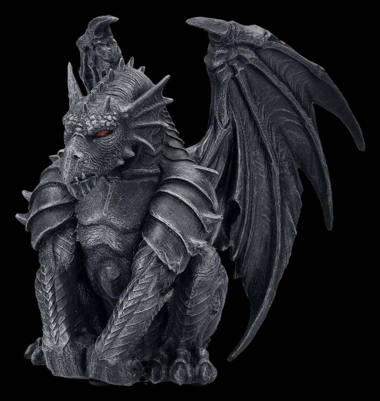 Hat da der große Drache die Position eines Gargoyle angenommen, oder der Gargoyle als Wächter die Gestalt eines Drachens? Das ist hier die Frage…. Die blutroten und wachsamen Augen des Drachens zeigen aber, dass er eines ist – nämlich ‚The Guard‘. Und als dieser wird der dämonische Drache eventuell wie ein Gargoyle auch tagsüber zu Stein erstarren, um Nachts gegen die finsteren Mächte zu kämpfen. Die 17 cm hohe, 15 cm breite und 18 cm tiefe Gothic Drachen-Figur ‚The Guard‘ wurde äußerst detailreich aus handbemaltem Kunststein (Polyresin) geschaffen. Als Wächter sollte dieser Drache mit Blick auf die Tür aufgestellt werden, so dass er alles im Blick behält und auch sofort gesehen wird.