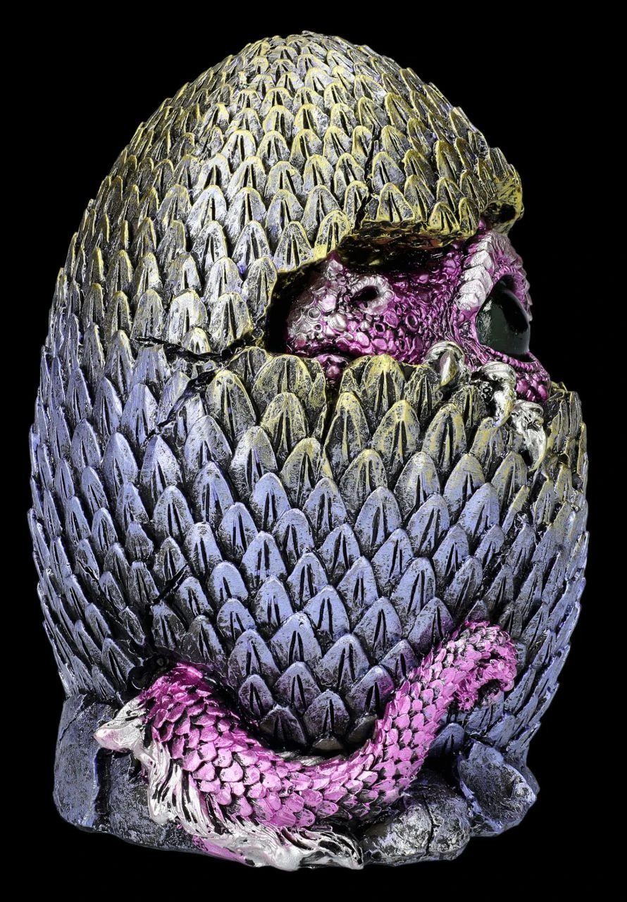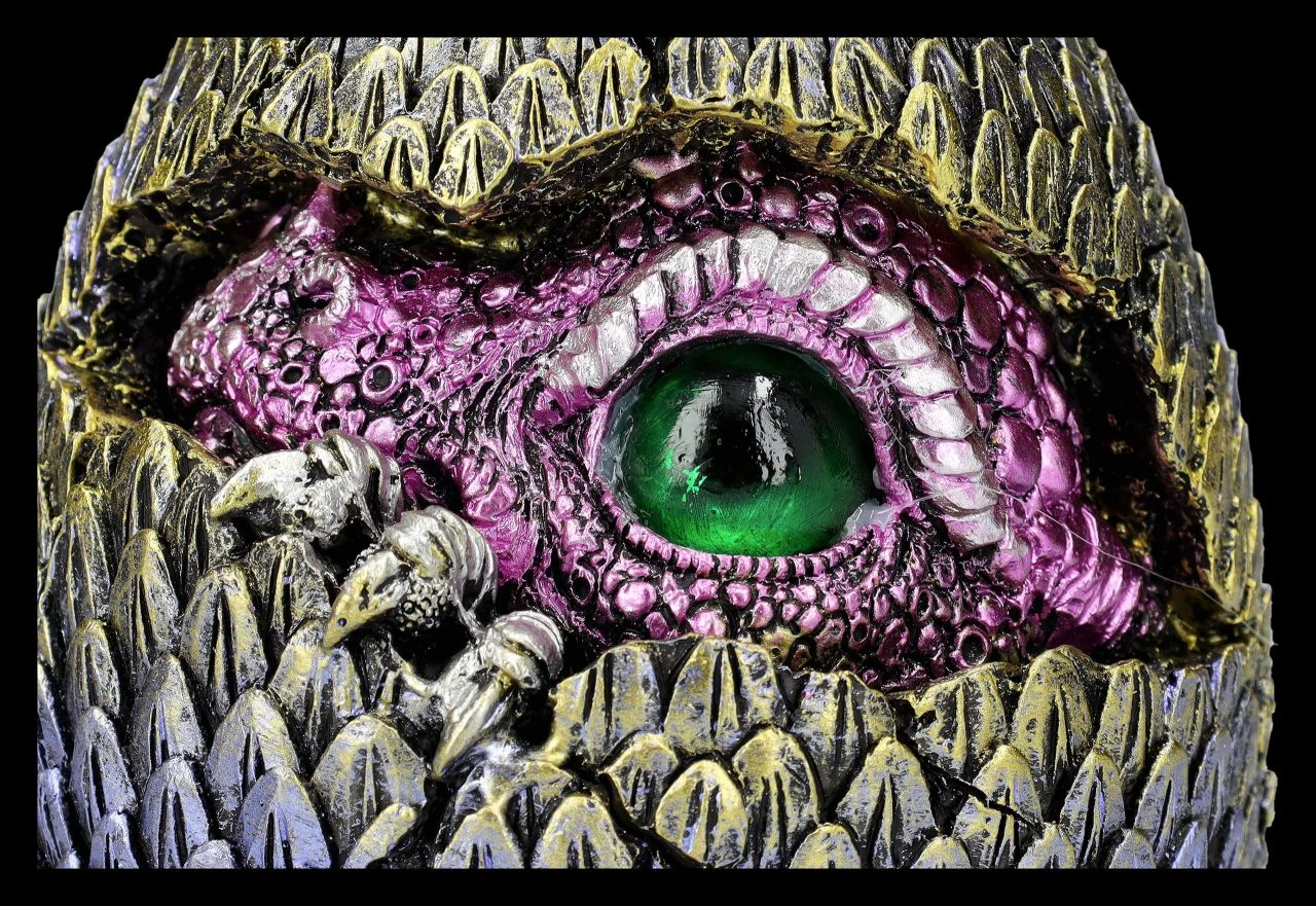 ‚Soll ich, oder lieber doch noch nicht?‘ Mit einem Auge schaut das kleine Drachenbaby vorsichtig aus dem gerade aufgebrochenen Ei. Noch scheint es sich in dem Versteck ganz wohl zu fühlen. Die Drachen Figur im Ei ist bis zu den Schuppen am Ei detailreich aus Kunststein (Polyresin) gefertigt und liebevoll von Hand bemalt. Durch die batteriebetriebene LED-Beleuchtung mit sanftem Farbwechsler leuchtet das Auge des Drachenjungen auf, was das Verstecken etwas schwierig macht… Die bezaubernde Drachen Figur ‚Hidden Hatching‘, also ‚Verstecktes Schlüpfen‘ ist 16 cm hoch, 11,5 cm breit und 12 cm tief. Für die LED-Beleuchtung werden 2 x AA Batterien benötigt, die nicht in der Lieferung enthalten sind. Alle, die sich für die verborgene und geheimnisvolle Welt der Drachen, Elfen und Feen interessieren, werden sich über diese liebevolle Drachen Figur als Geschenk sicherlich freuen.