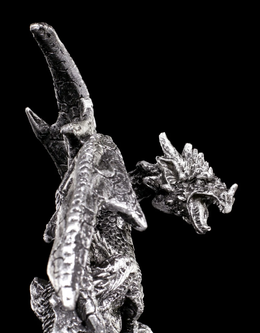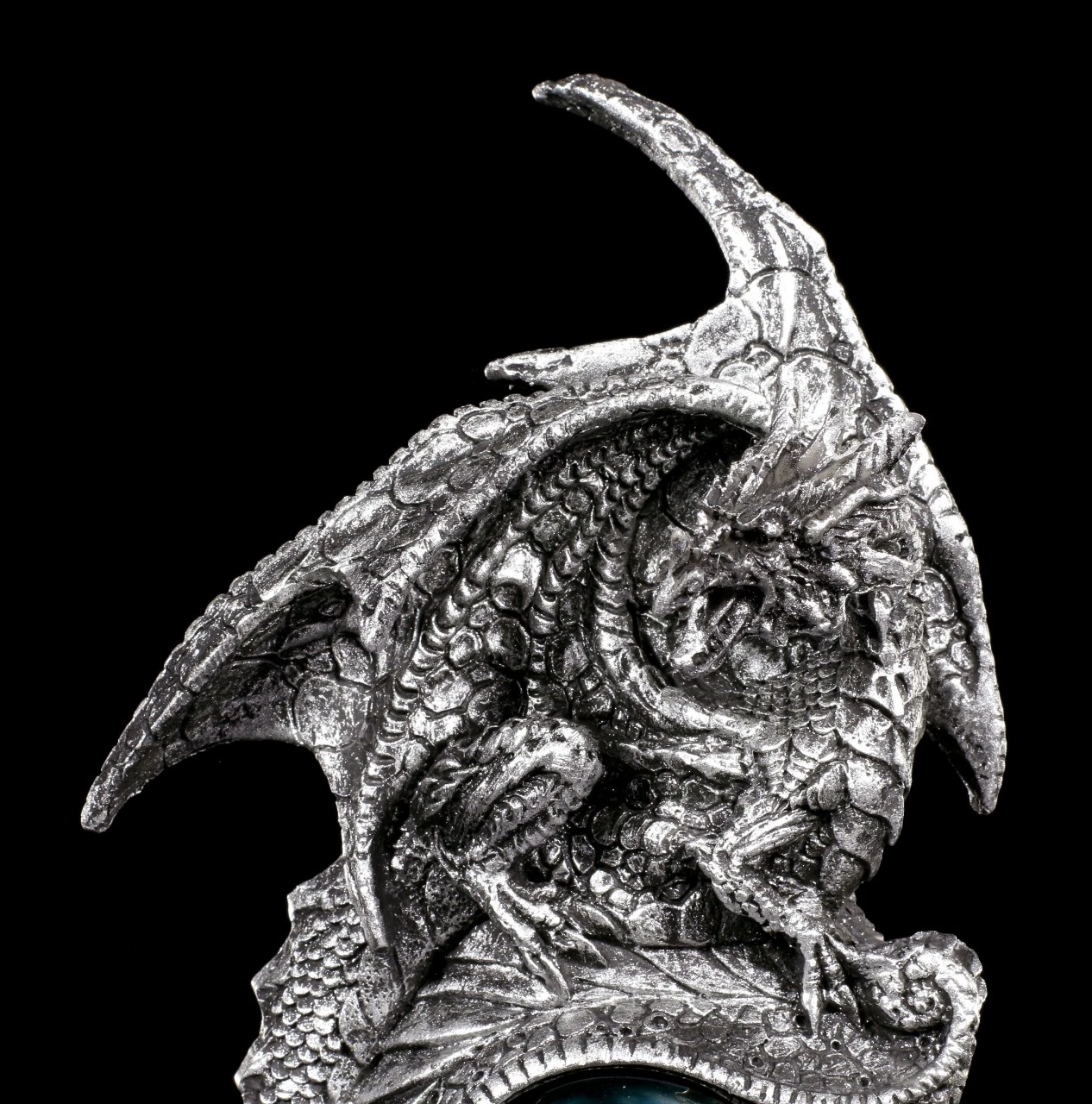 Silberfarbene Drachenfigur bewacht grünes Auge
