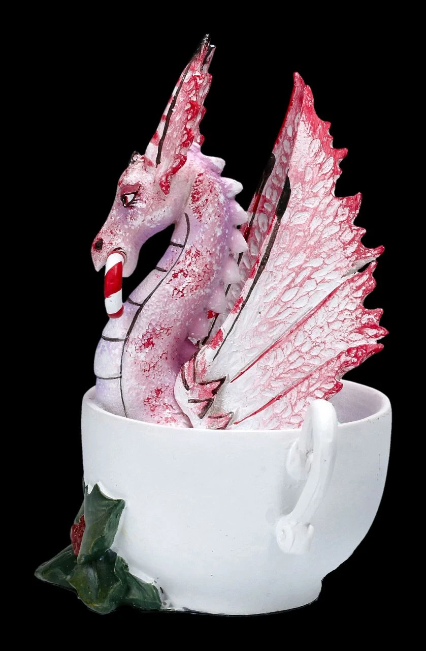 Na, da hat sich der kleine Drache mit der Zuckerstange zwischen den Zähnen den richtigen Platz ausgesucht, um auf Weihnachten zu warten. Denn aus der Tasse mit dem Ilexblatt wird so schnell nicht einmal ein Pfefferminztee getrunken werden können. Die lustige Drachen Figur Perfectly Peppermint aus liebevoll handbemaltem Kunststein (Polyresin) ist 14 cm hoch, 9,5 cm breit und 9 cm tief. Sie ist nicht nur für Drachenfreunde ein witziges Geschenk.