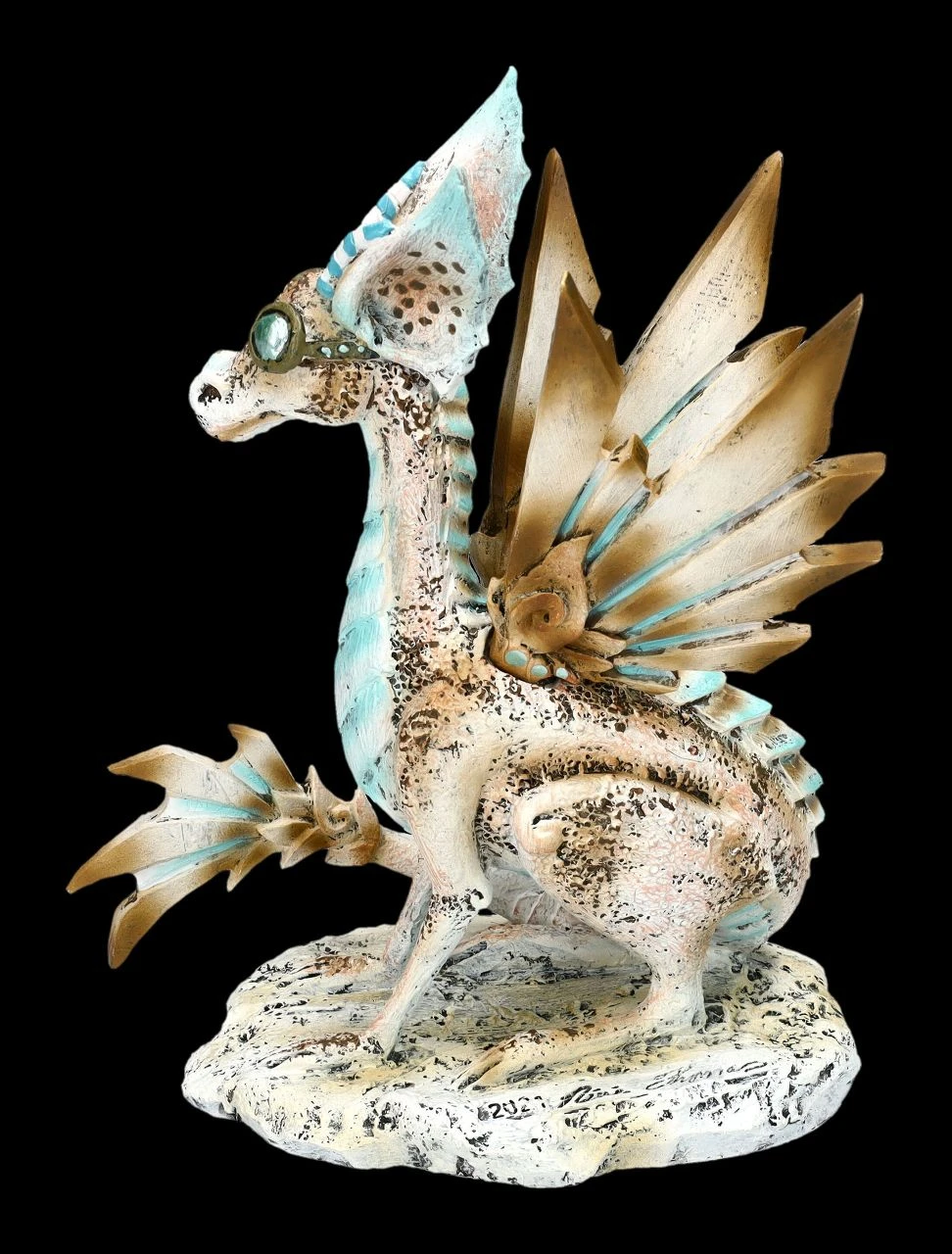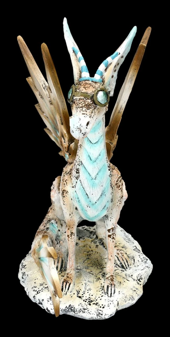 Der fantastischer, im Steampunk-Stil handbemalter Drache ist ein perfektes Geschenk für Sammler der Arbeiten von Amy Brown und für alle, die wie sie von der Welt der Elfen, Feen und Drachen fasziniert sind. Bereits als Kind hat sich die amerikanische Fantasykünstlerin Amy Brown für die sagenhafte Welt der Elfen, Feen und Drachen interessiert und alle Geschichten darüber gelesen. Später machte sie diese Welt zum Mittelpunkt ihrer kreativen Arbeit. So entstanden wunderbare Arbeiten, die der eigenen Fantasie Raum geben, wie dieser große Drache im Steampunk-Stil aus hochwertigem Kunststein (Polyresin). Sammler werden von dieser Drachen-Figur von Amy Brown begeistert sein. Der Drache ist 16 cm hoch, 13 cm breit und 8,5 cm tief. Die Flügel sind zum Stecken.