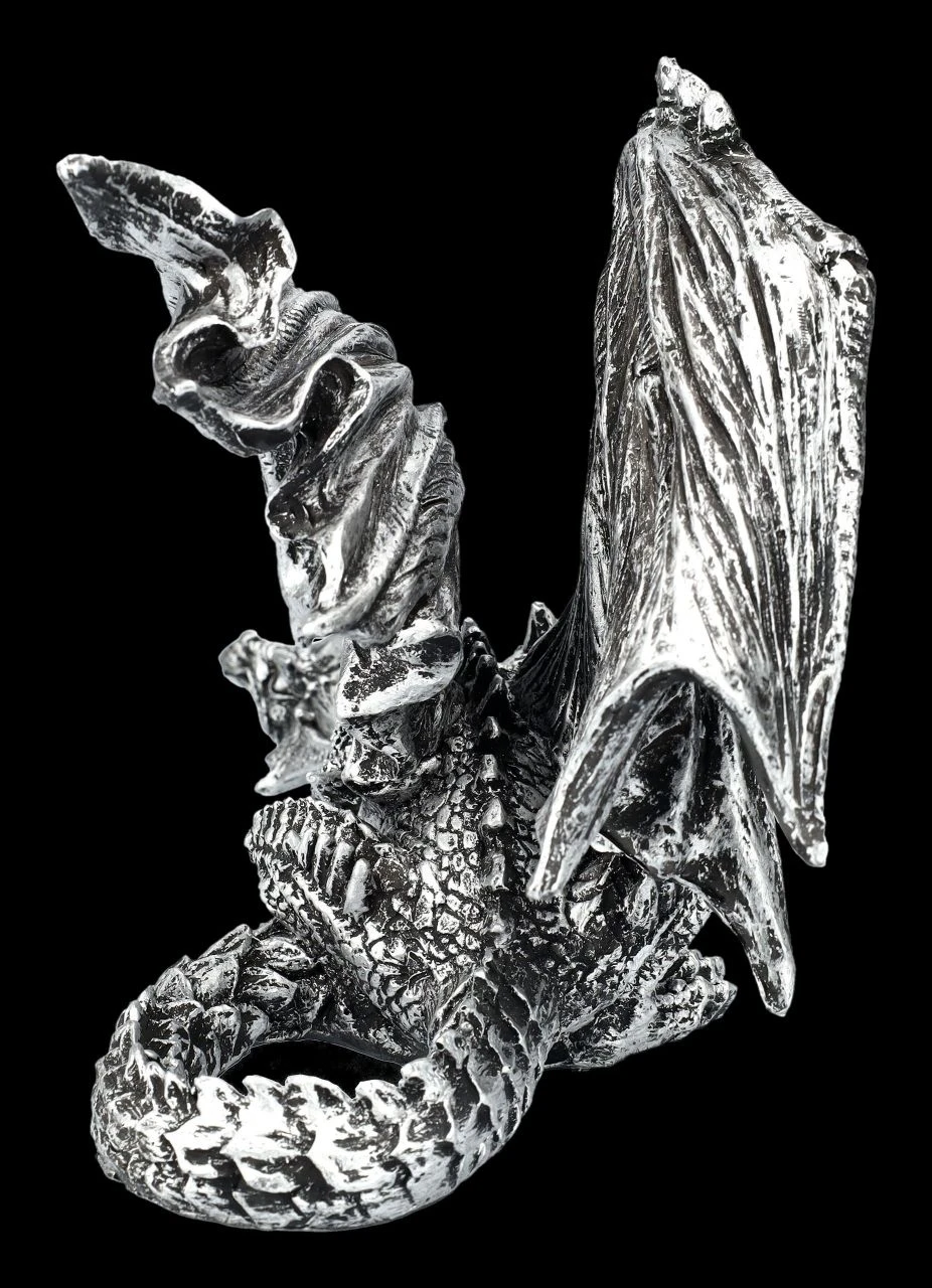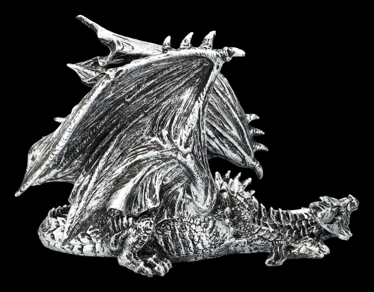Vorsichtig und seine Beute fest im Blick schleicht sich der silberne Drache an. Er muss sich sehr langsam bewegen, damit kein Rascheln seine Beute warnt. Das silberfarben handbemalte Fabelwesen wurde sorgfältig aus Kunststein (Polyresin) gefertigt. Mit der Höhe von 16,5 cm, der Breite von 24,5 cm und der Tiefe von 12,5 cm ist der Drache, der sich hier so vorsichtig anschleicht, auch ein fantasievolles Geschenk für alle Drachenfreunde.