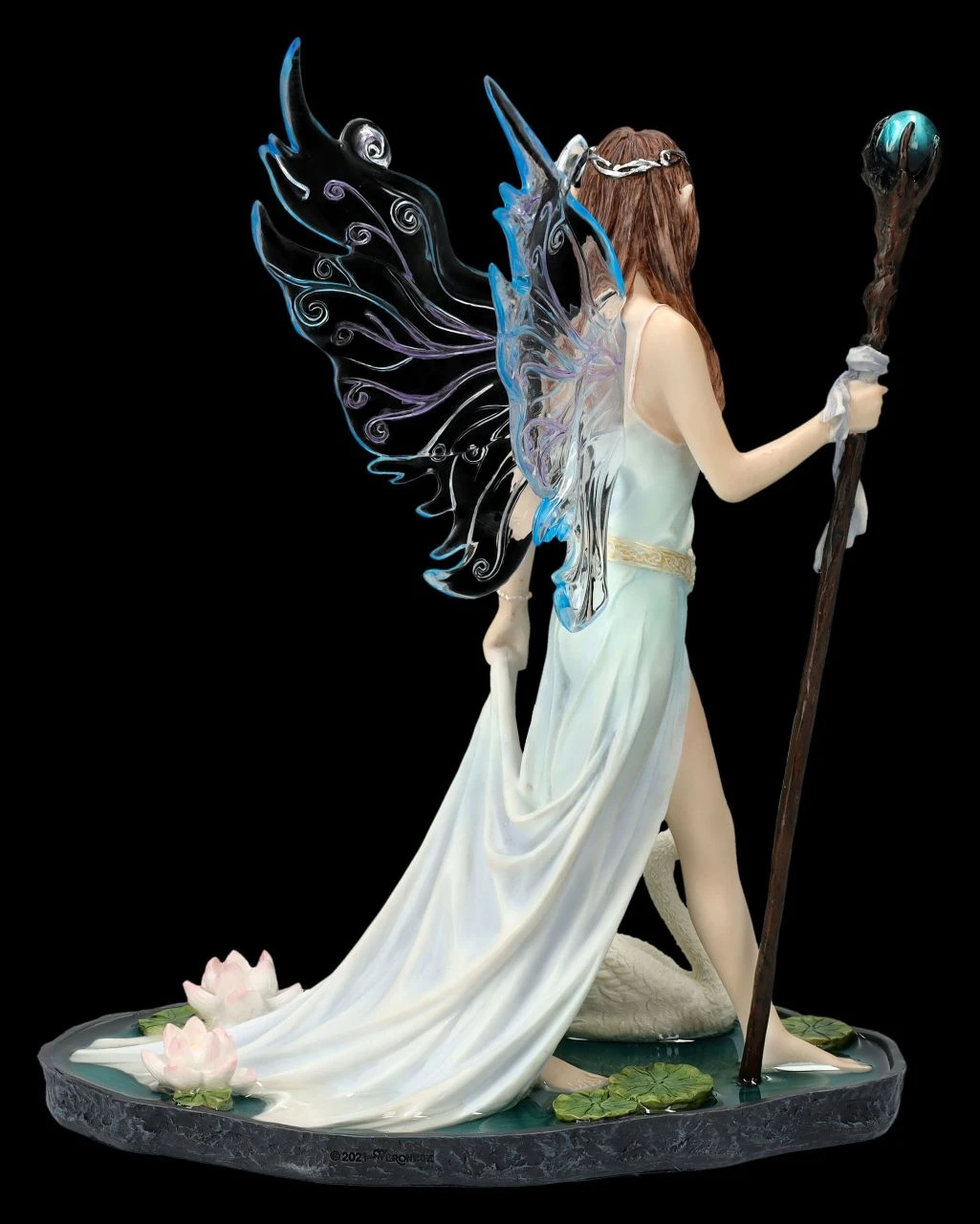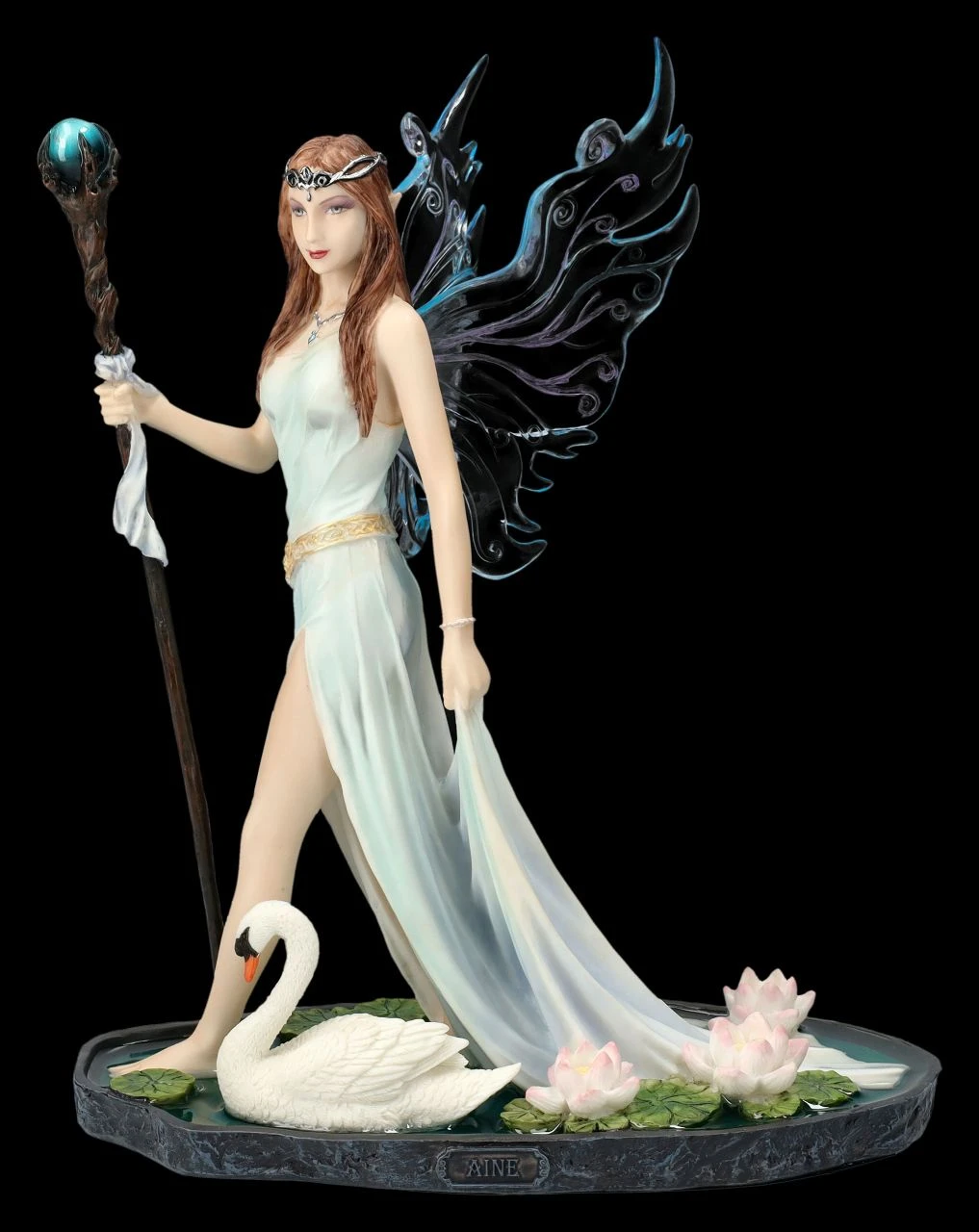 Kunstvolle Darstellung einer Elfenwelt: Aine mit Zauberstab und Schwan