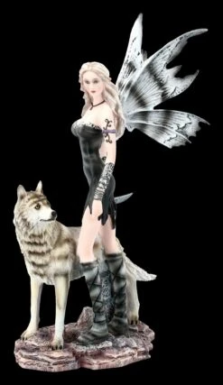 Die Nachtelfe Elleth wandert mit ihrem zahmen Wolf durch den nächtlichen Wald. Zu ihrem kurzen schwarzen Kleid trägt sie hohe geschnürte Stiefel. Elleth ist auf dem Weg zu einem geheimen Treffen mit ihren Freunden. Diese bezaubernde handbemalte Elfe aus Kunststein (Polyresin) ist der Blickpunkt in Ihrer Elfensammlung. Die Flügel der 27 cm hohen, 17 cm breiten und 11,5 cm tiefen fantastischen Elfen-Figur sind zum Stecken.