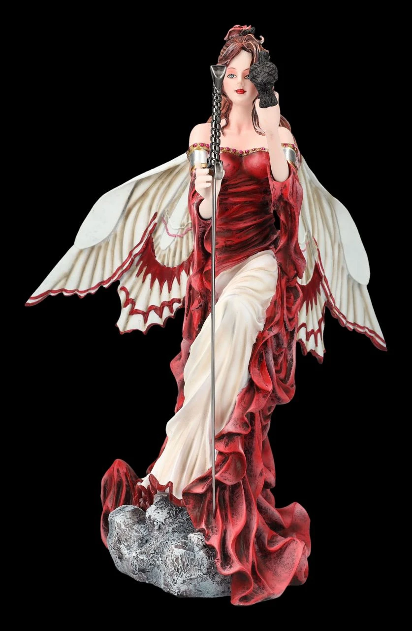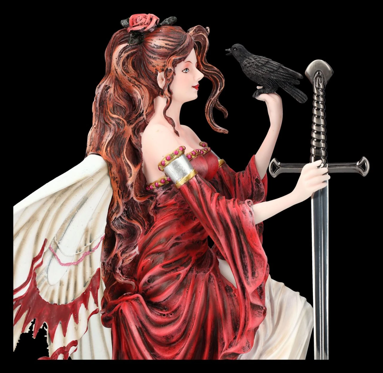 Wie eine wunderschöne Göttin sitzt die Elfe Gidith hoch oben auf einem Felsen. Auf der erhobenen linken Hand sitzt ihr Rabe, der sie ständig begleitet. In der rechten Hand hält sie ein Schwert, das sich bei genauerem Hinsehen als Brieföffner herausstellt. Ihre rötliche Haarpracht fällt in langen Wellen über ihre Schultern. Das prächtige dunkelrote Gewand der märchenhaft schönen Elfe Gidith bauscht sich über dem seidig weich fallendem weißen Unterkleid. Ihre zarten und perfekt zum Gewand passenden Flügel sind zum Stecken. Die bezaubernde Elfe stammt aus dem Atelier von Nene Thomas, der berühmten Fantasy-Künstlerin aus Oklahoma. Die 28 cm hohe, 22,5 cm breite und 21 cm tiefe Elfen-Figur wurde mit großem Aufwand aus Kunststein (Polyresin) gefertigt und mit viel Liebe zum Detail von Hand bemalt. Das Schwert aus Metall als Brieföffner ist 17 cm lang. Die Elfe Gidith mit dem Brieföffner ist ein herrliches und auffallendes Accessoire für jeden Schreibtisch und man kann ihr nur wünschen, dass sie stets ausschließlich liebevolle Briefe öffnen muss. Für alle Fans von Nene Thomas und für jeden, der von den märchenhaften Welt der Elfen begeistert ist, ist dieser prächtige Brieföffner ein wunderbares Geschenk.