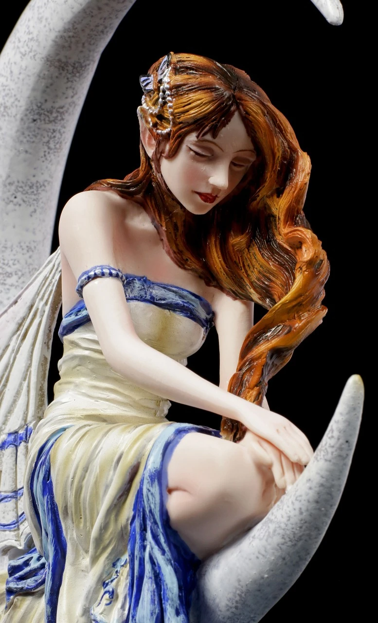 Die zierliche Elfe hat es sich auf dem Halbmond bequem gemacht und ist ganz in Gedanken versunken. Das Kleid der wunderschönen Elfe ist in zarten gelben und blauen Tönen gehalten. Die Elfe Memory der Künstlerin Nene Thomas wurde aus fein handbemaltem Kunststein (Polyresin) gestaltet und wird in einer Geschenkverpackung geliefert. Sie ist ein tolles Präsent für einen Sammler.
