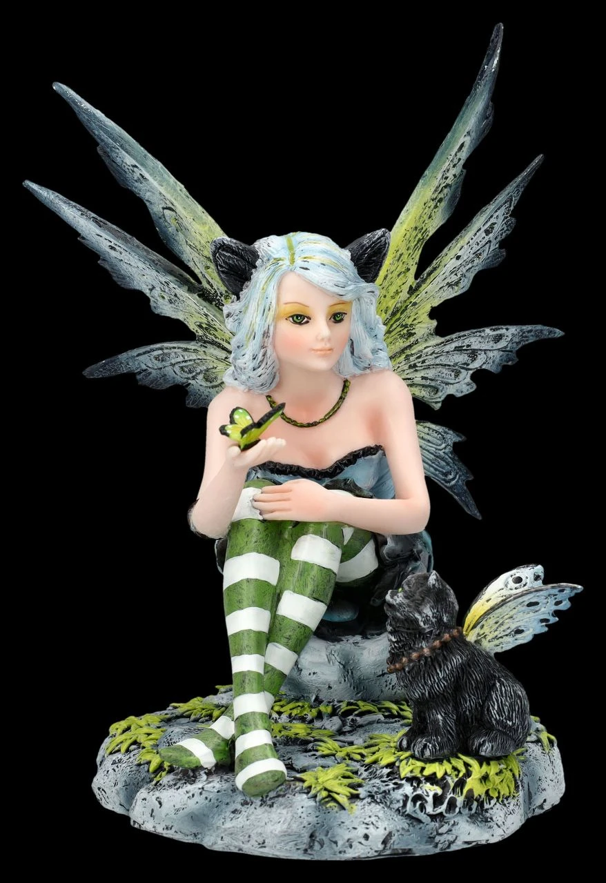 Schwarzen Katzen werden nicht nur bei uns, sondern natürlich auch im Elfenreich magische Fähigkeiten zugesprochen. Nun möchte die kleine Elfe aber schon ganz gerne wissen, was ihre schwarze Katze so alles kann. Ob sie zum Beispiel mit den Flügelchen, die sie ihr verpasst hat, wie ein Schmetterling fliegen kann? Nun sitzt die kleine Elfe in ihrem zarten Kleidchen und den grün geringelten Strümpfen auf einem Stein am Waldboden und zeigt ihrem aufmerksamen Kätzchen, wie federleicht der Schmetterling auf ihrer Hand gelandet ist. Die niedliche, 16 cm hohe, 12,5 cm breite und 13,5 cm tiefe Elfen-Figur mit der schwarzen Elfen-Katze ist ein hübsches Geschenk für alle Elfen- und Katzen-Freunde. Sie ist aus liebevoll handbemaltem Kunststein (Polyresin) und die grün-schwarz gesprenkelten Flügel der Elfe sind zum Stecken.