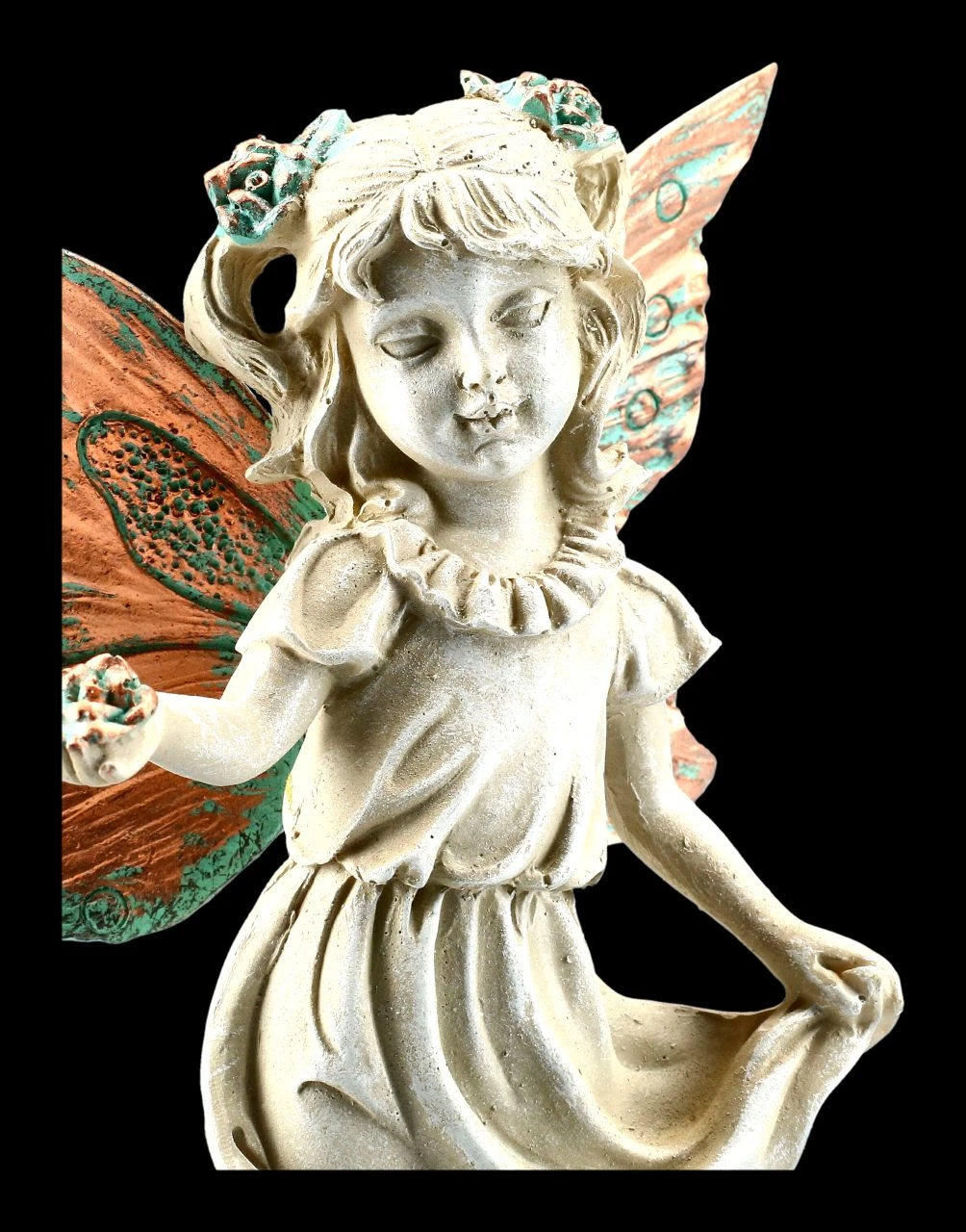 Diese süße zarte Waldelfe freut sich, gemeinsam mit ihrem Eichhörnchen, auf einen schönen Platz mitten in Ihrer Herbstdeko oder zwischen grünen Pflanzen auf der Fensterbank. Die herbstblätterfarbenen Flügel mit den grünen Akzenten und die Blüte in ihrer Hand haben dieselbe Farbe wie das Eichhörnchen. Diese süße Elfe ist 18,0 cm hoch, 12,0 cm breit, 6,0 cm tief und aus handbemaltem Kunststein (Polyresin).