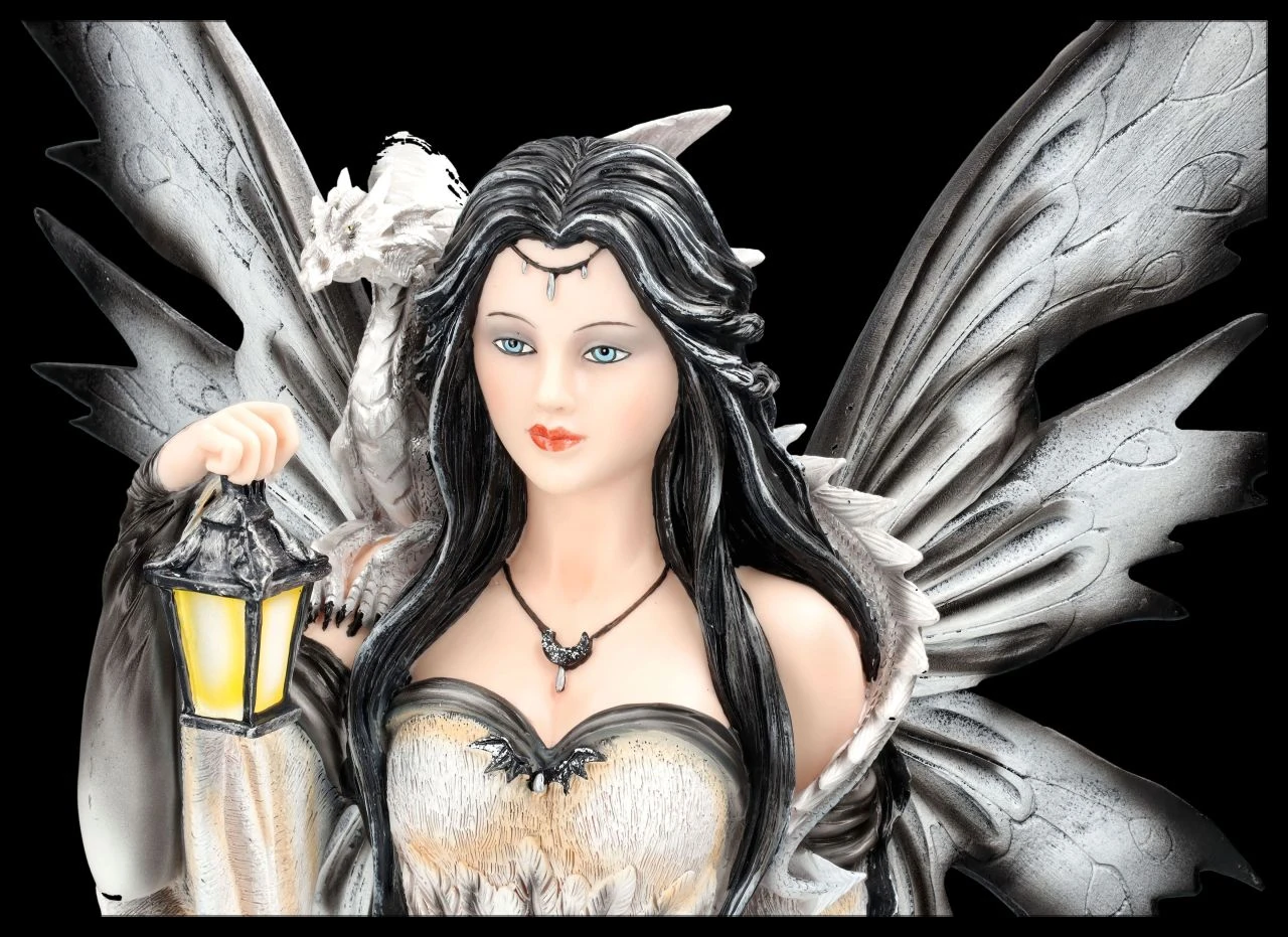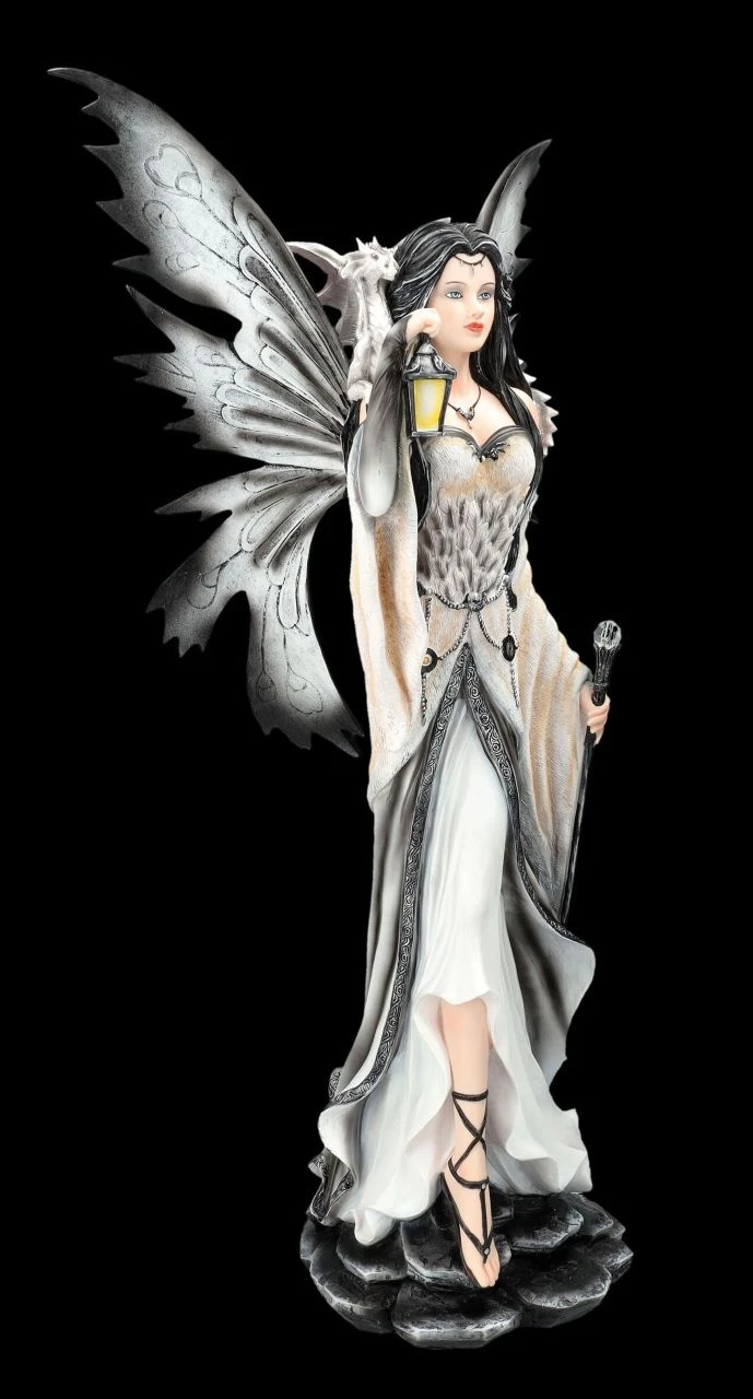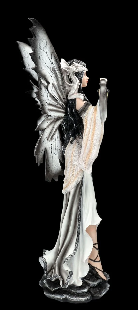Wenn die geheimnisvolle Magierin und Wächterin des Feenreiches in den magischen Nächten mit ihrem Zauberstab bei den Festen der Bewohner der Märchenwälder erscheint, wird sie von den dunklen Mächten gefürchtet und von allen anderen bewundert. Denn selbst für alle Waldbewohner ist Formenis manchmal nur wie der Strahl des Mondes oder wie Sternenstaub zu sehen, wenn sie mit ihrer Laterne in der Hand und ihrem kleinen weißen Drachen auf den Schultern durch die Wälder streift. In ihrem langen weißen Kleid mit dem schönen Überrock mit bestickter Borte und mit dem gefiederten Mieder ist die faszinierende große und wunderschöne Elfe Formenis sehr beeindruckend. Sie sollte unbedingt einen Platz bekommen, an dem sie wie eine Wächterin magisch den Raum beherrschen und von Besuchern sofort entdeckt und bewundert werden kann. Die 63 cm hohe, 34,5 cm breite und 26 cm tiefe geheimnisvolle und anmutige Elfen-Figur ist detailreich aus handbemaltem Kunststein (Polyresin) gefertigt und wurde liebevoll von Hand bemalt. Die großen filigranen und sehr detailreichen Flügel sind zum Stecken. Wer von der Welt der Elfen, Feen und Drachen bezaubert ist, wird sich sicherlich über diese magische und sehr faszinierende Elfen-Figur freuen. Sie ist daher ein wunderbares Geschenk und auch eine perfekte Ergänzung einer Elfen-Sammlung.