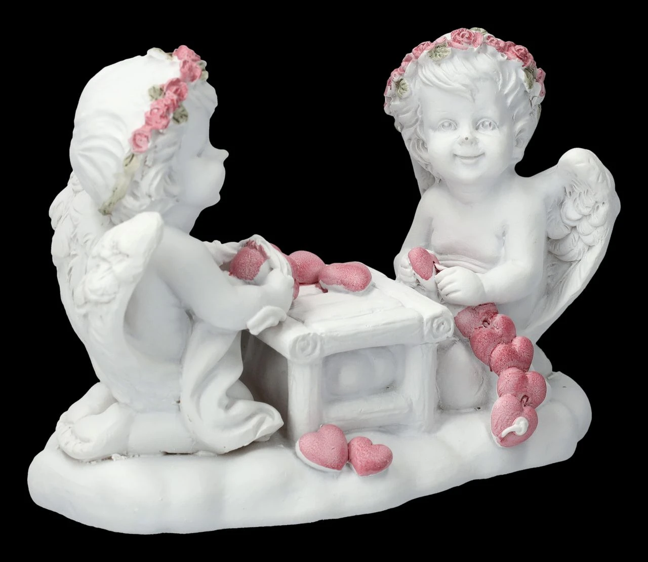 Liebe zu verschenken ist ihre Aufgabe, daher sitzen die beiden niedlich Putten fröhlich an ihrem Tisch und basteln zahlreiche Herzen. Je fleißiger sie sind, umso besser, denn sie gehören zu der Engelschar die in unserem Shop gelandet ist. Die Figur mit den bastelnden Putten ist 8 cm hoch, 11 cm breit und 5,5 cm tief. Sie wurde aus liebevoll handbemaltem Kunststein (Polyresin) gefertigt und ist nicht nur für jeden Hochzeitstisch eine tolle Deko, sie ist auch ein fantastisches Geschenk für den Engel seines Herzens.