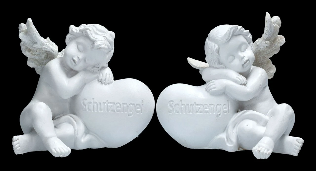 Sie möchten sich mit einer lieben Freundin oder einem Freund Ihren Schutzengel teilen? Diese beiden kleinen Schutzengel, die sich auf ein jeweils dem anderen zugewandtes Herz lehnen, sind doch einfach zu süß ! Die Engelfiguren im 2er Set sehen edel wie aus weißem Porzellan aus. Sie sind aus Kunststein (Polyresin) gefertigt und auf den Herzen ist jeweils der Schriftzug ‚Schutzengel‘ eingeprägt. Die Engel sind je 10 cm hoch, je 10 cm breit und je 8,5 cm tief.