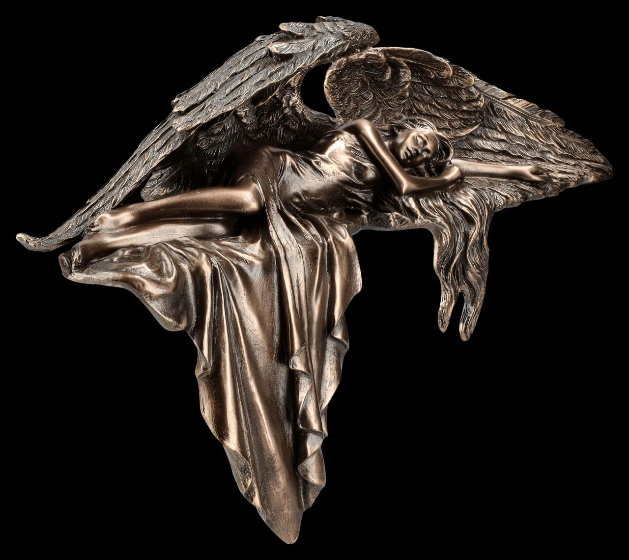 Der Flug scheint anstrengend gewesen zu sein und so hat sich der wunderschöne Schutzengel nur ganz kurz auf dem Schrank oder einem Regal hingelegt und ist dabei eingenickt. Lediglich die großen Flügel geben ihm Halt. Das lange Kleid, das den zauberhaften Engel wie ein Schleier bedeckt, hängt, wie auch das lange gewellte Haar, über die Kante. Die edel bronzierte Engel-Figur aus Kunststein (Polyresin) ist 13,5 cm hoch, 20 cm breit und 6,5 cm tief und stammt aus der Studio Collection von Veronese. Der Schutzengel als Kantenhocker ist einfach bezaubernd und hat einen wirklich guten Platz verdient, an dem er sofort entdeckt wird. Außerdem sind Schutzengel auch immer willkommene Geschenke, die viel Freude bereiten.