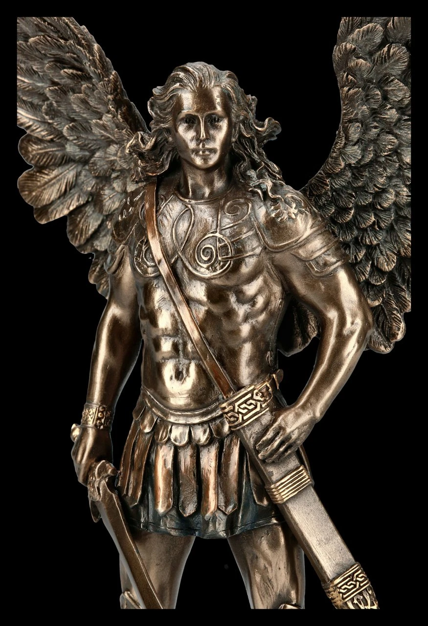 Mit hoch aufgerichteten Flügeln und gezücktem Schwert steht der Erzengel Michael auf einem Feld. Seine Aufgabe ist es, sich gegen das Böse zu stellen, damit das Gute siegen kann. Die bronzierte und zurückhaltend colorierte Engel Figur von Veronese gehört zu der Serie The Holy Journey und ist aus hochwertigem Kunststein (Polyresin) gefertigt. Sie besticht durch die vielen Details und die edle Ausführung.