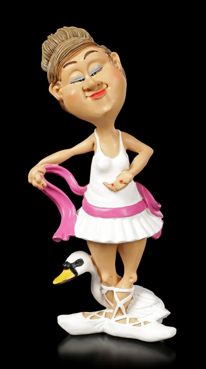 Die Ballett Tänzenerin übt mit sicheren und anmutigen Bewegungen immr wieder Ballettschritte aus Schwanensee. Als Maskottchen hat sie daher stets ihren weißen Schwan dabei. Das weiße Ballettkostüm erinnert selbst an einen eleganten Schwan. Die lustige Funny Job Figur aus Kunststein (Polyresin) ist im berühmten Karikatur Stil gehalten und liebevoll handbemalt.