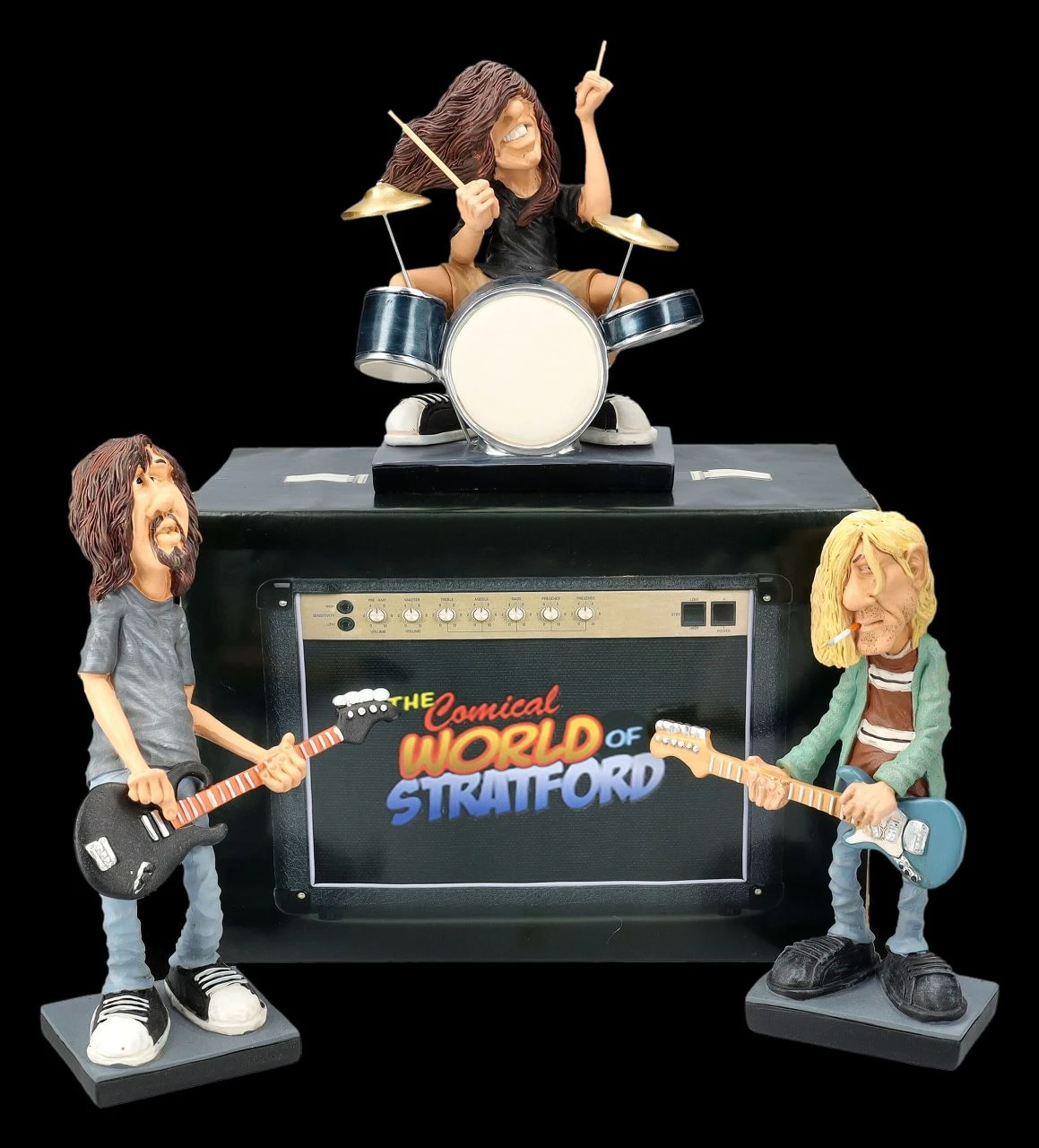 Der Schlagzeuger und Allroundmusiker Dave bereichert mit seinem Können einige berühmte Bands und schrieb gemeinsam mit Kurt und Kris Rockgeschichte. Heute macht er als Sänger und Rhythmusgitarrist Musik auch in seiner eigene Band. Warren Stratford, der Künstler, der jeden mit seinen humorvollen Karikaturen begeistert, hat auch bei dieser Figur von David ‚Dave‘ als Drummer den Charakter perfekt eingefangen. In aufwändiger Handarbeit wird jede Figur von Warren Stratford persönlich entworfen und dann aus liebevoll handbemaltem Kunststein (Polyresin) hergestellt. Die 15 cm hohe, 12 cm breite und 11 cm tiefe Figur gehört – am besten gemeinsam mit Kurt und Kris – einfach in jede Sammlung und ist daher für alle Fans ein perfektes Geschenk. Auch zahlreiche weiteren Karikaturen der großen Stars aus allen möglichen Stilrichtungen, wie Pop + Rock, Grunge etc. etc., sind in unserem Shop zu finden.