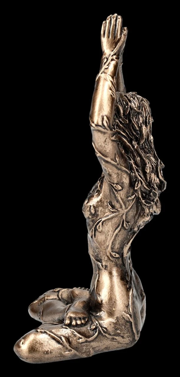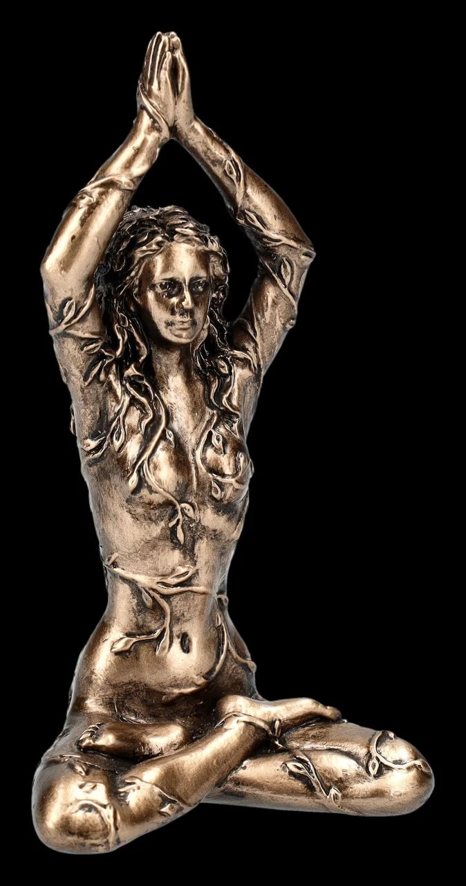 In der Lotus Position sitzt Gaia meditierend auf dem Boden. Ranken mit Blättern umwinden die nackte Figur der Göttin, die in der griechischen Mythologie als Erdgöttin und als erstes Wesen auf der Erde verehrt wird. Die kleine, sorgfältig aus Kunststein (Polyresin) gefertigte und edel bronzierte Figur aus der Studio Collection von Veronese ist 8 cm hoch, 4,5 cm breit und 3,5 cm tief. Sie ist nicht nur eine schöne Deko für ein Yoga-Studio oder den privaten Yoga-Raum, sondern kann auch überall hin mitgenommen werden. Die kleine Skulptur der meditierenden Gaia ist aber auch ein wunderbares Geschenk.