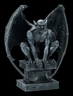 Tagsüber zu Stein erstarrt, erwachen Gargoyles in der Nacht zum Leben und verjagen das Böse. Der Wächter mit seinen großen Schwingen sitzt lauernd auf einem Sockel. Er ist sehr ausführlich und detailreich aus Kunststein (Polyresin) gefertigt und handbemalt. Mit seiner Höhe von 19 cm, der Breite von 15,5 cm und der Tiefe von 8,5 cm ist der Wächter mit seinen großen Flügeln eine wirklich faszinierende Gargoyle Figur. Im Eingangsbereich aufgestellt, wird er auch zum Beschützer Ihres Heimes.