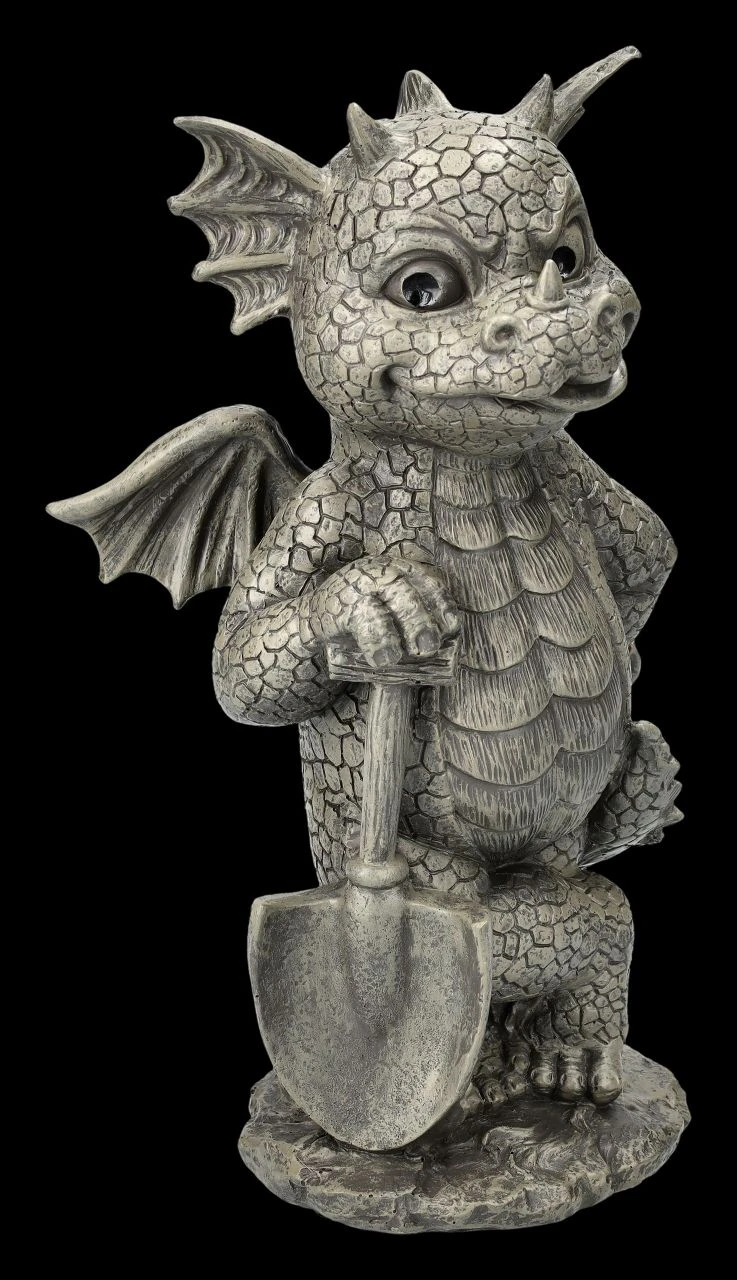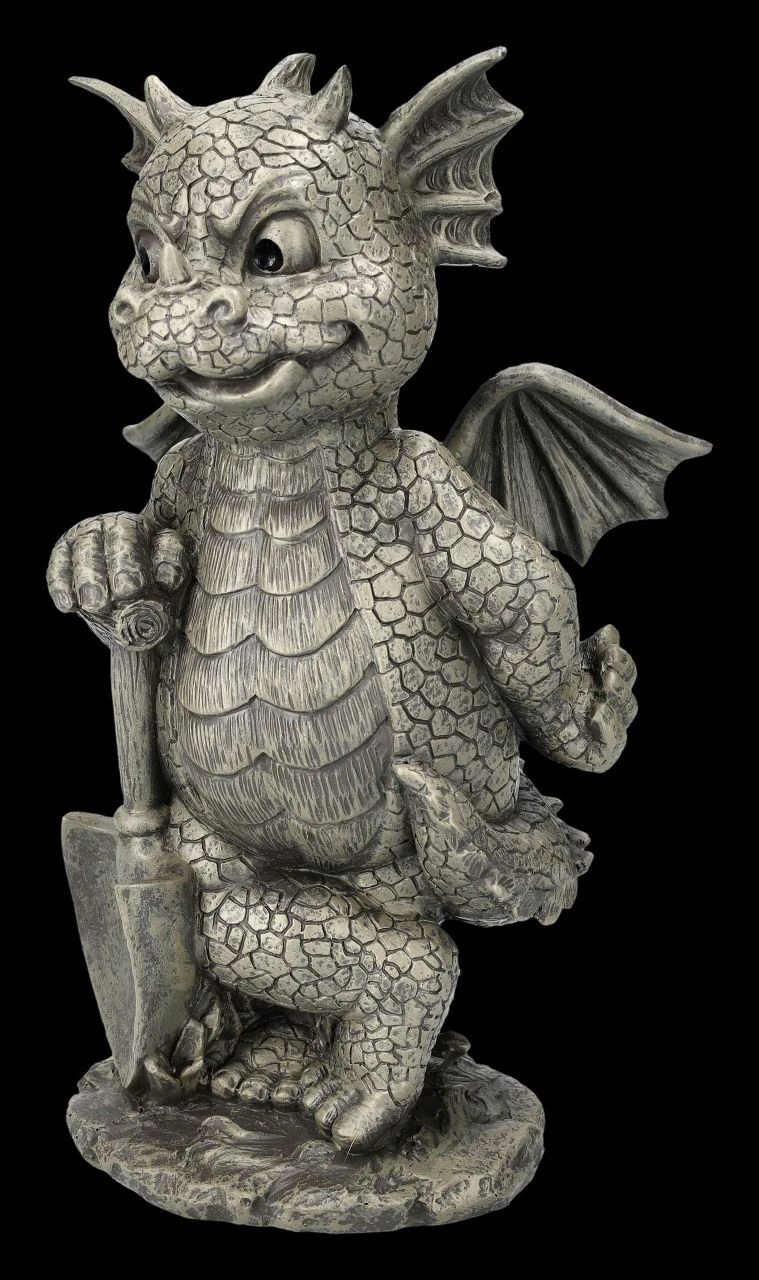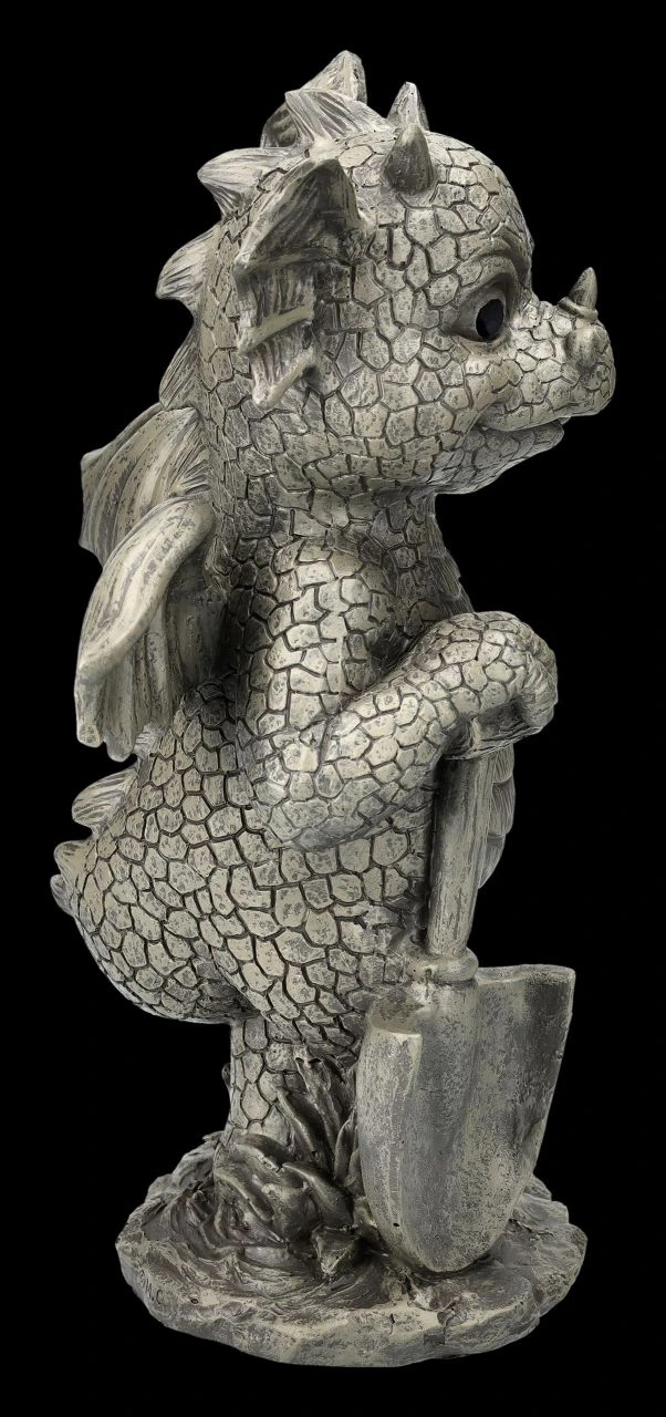 Gartenarbeit kann, wie man diesem lustigen Drachen ansieht, doch schon sehr anstrengend sein. Vielleicht hätte er zwischendurch etwas trinken sollen, dann würde ihm die Zunge nicht so heraushängen. Der 29,5 cm hohe, 17 cm breite und 13,5 cm tiefe Drache als Gärtner ist detailreich aus liebevoll handbemaltem Kunststein (Polyresin) gefertigt. Ob im Gartenbereich, der Terrasse, dem Balkon oder auch auf der Blumenbank im Wohnbereich – dieser niedlich Gärtner macht überall eine gute Figur.