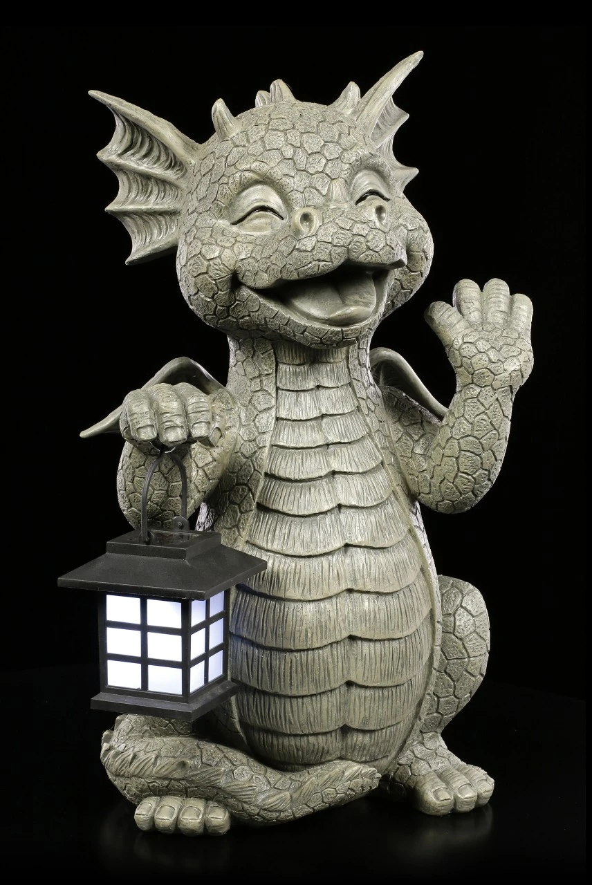 Am besten in der Nähe Ihres Eingangs aufgestellt, leuchtet der hinreißende Drache Big Boy Ihren Gästen den Weg! Der Garten Drache mit einer Höhe von 45 cm, der Breite von 24 cm und der Tiefe von 20 cm hat seine Hand fröhlich zum Gruß erhoben und hält in der anderen eine Solar Laterne, die nach Einbruch der Dunkelheit automatisch leuchtet. Ist die Gartenfigur Big Boy aus handbemaltem Kunststein (Polyresin) nicht umwerfend?
