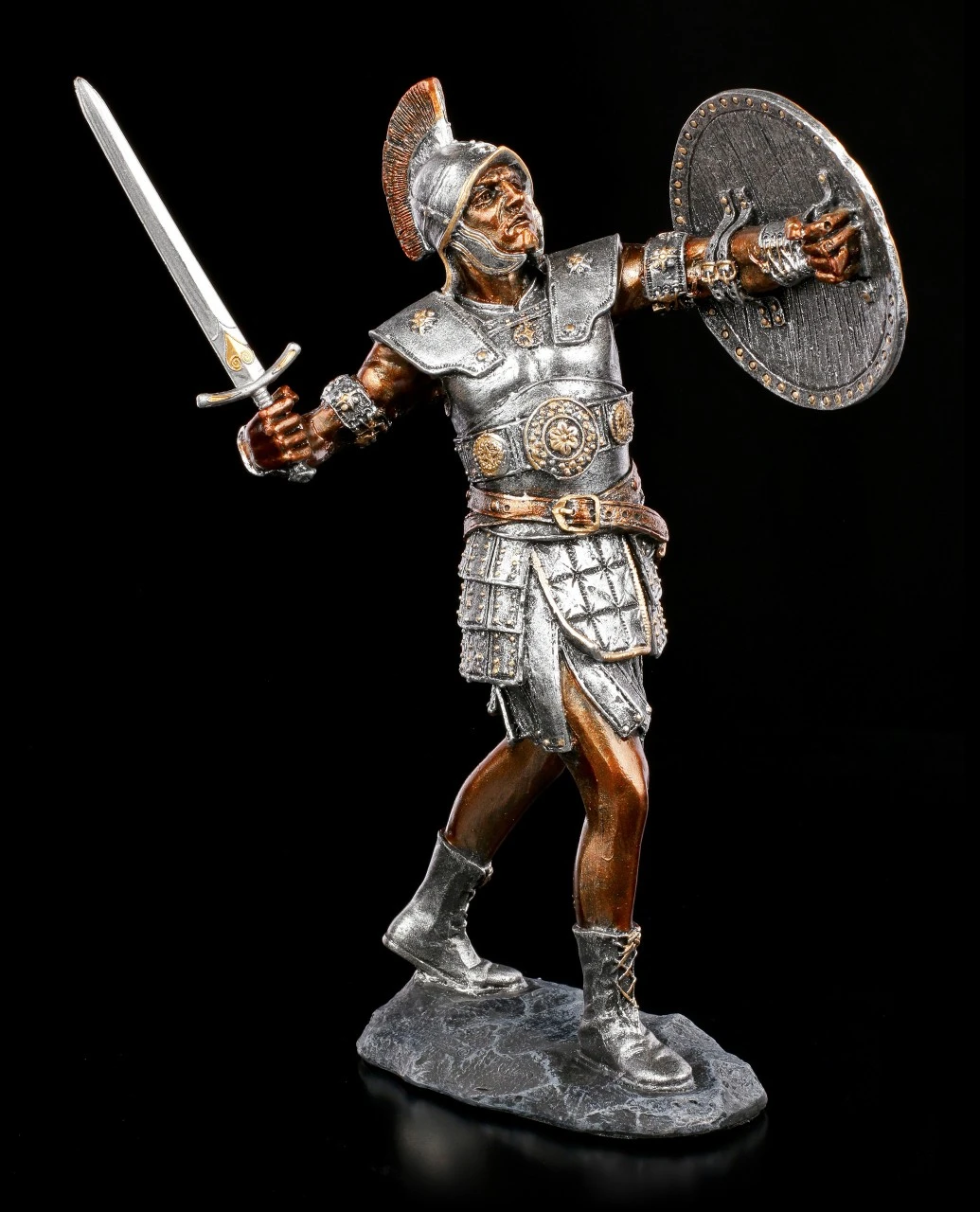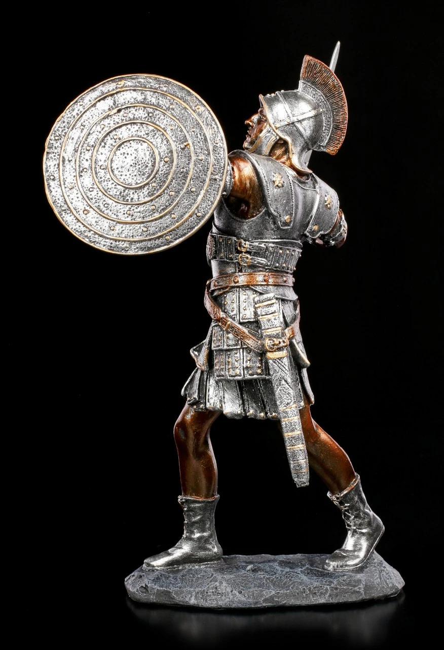 Holen Sie sich die aufregende Atmosphäre eines altrömischen Gladiatorkampfes nach Hause. Der tapfere Gladiator hebt zur Abwehr sein Schild, aber gleich geht er wieder zum Angriff über.
