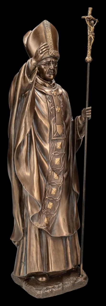 Am 13. März 2013 wurde der argentinische Kardinal Jorge Mario Bergoglio zum 266. Bischof von Rom und damit zum Papst gewählt und wurde zu Papst Franziskus. Er hat eine neue Ära in der katholischen Kirche eingeleitet und mit seiner Bescheidenheit und Liebe und seinen Predigten die Herzen der Menschen erreicht. Diese beeindruckende, 46 cm hohe, 15,5 cm breite und 13 cm tiefe Figur von Papst Franziskus ist aus edel bronziertem Kunststein (Polyresin). Sie zeigt Papst Franziskus in seinem lithurgischen Messgewand, wie der Mitra, dem Pallium (also dem breiten Band um Schulter und Hals, in dem sechs Kreuze eingestickt sind), dem Fischerring und dem Hirten- oder Kreuzstab mit Jesus am Kreuz am oberen Ende. Die detailreiche und schön bronzierte Heiligen Figur ist ein sofortiger Blickfang und für alle, die Papst Franziskus bewundern, auch ein perfektes Geschenk.