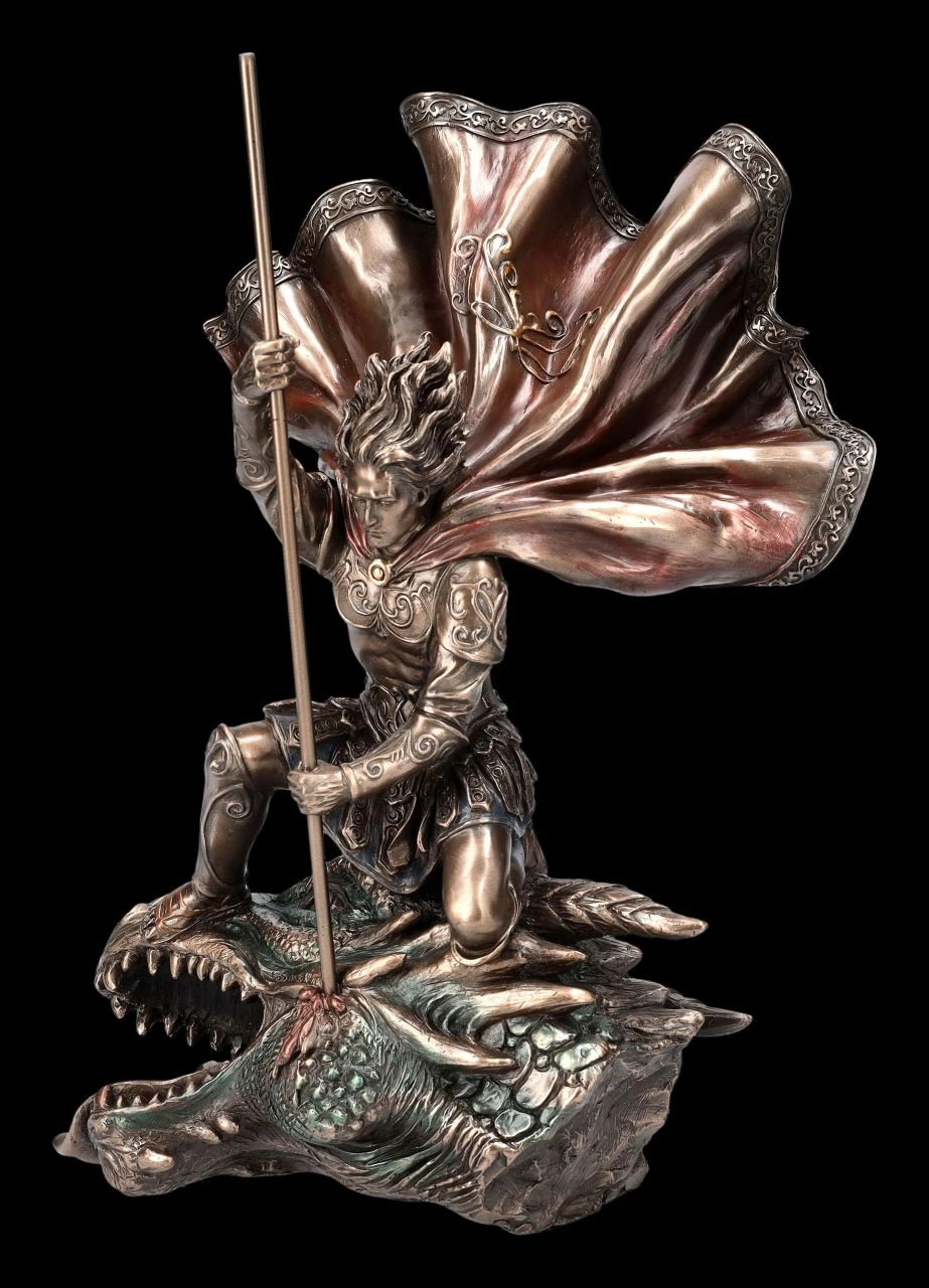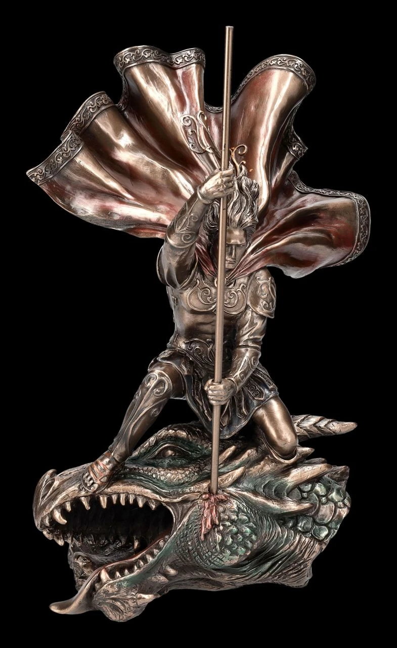 Die Skulptur des Heiligen Georg auf dem Drachenkopf stammt aus der Studio Collection von Veronese und wurde aus edel bronziertem und zurückhaltend colorierten Kunststein (Polyresin) gefertigt. Sie ist 28 cm hoch, 19 cm breit und 13,5 cm tief und zeigt einen edlen Ritter mit wehendem Umhang, wie er mit seiner Lanze in einen riesigen Drachenkopf sticht. Den Legenden nach stammte der heilige Georg aus Kappadokien in der heutigen Türkei. Ein feuerspeiender Drache hatte das Volk terrorisiert und um den Drachen zu besänftigen sollte eine jungfräuliche Königstochter geopfert werden. Georg soll die Königstochter vor dem Drachen gerettet und dann das Volk dazu gebracht haben, sich aus Dankbarkeit taufen zu lassen. Bei der Verfolgung der Christen durch Diokletian wurde Georg im Jahr 305 n.Chr. festgenommen, gefoltert und enthauptet. Doch der Sieg Georgs über das Ungeheuer wurde als Sieg des Guten über das Böse gedeutet. Die Kreuzritter verehrten ihn für seine edle Tapferkeit und brachten so die Geschichte um den Heiligen Georg und seinen Kampf gegen den Drachen in Umlauf. Die detailreiche Figur des Heiligen Georg mit dem Drachenkopf ist nicht nur für edle Ritter ein fantastisches Geschenk.
