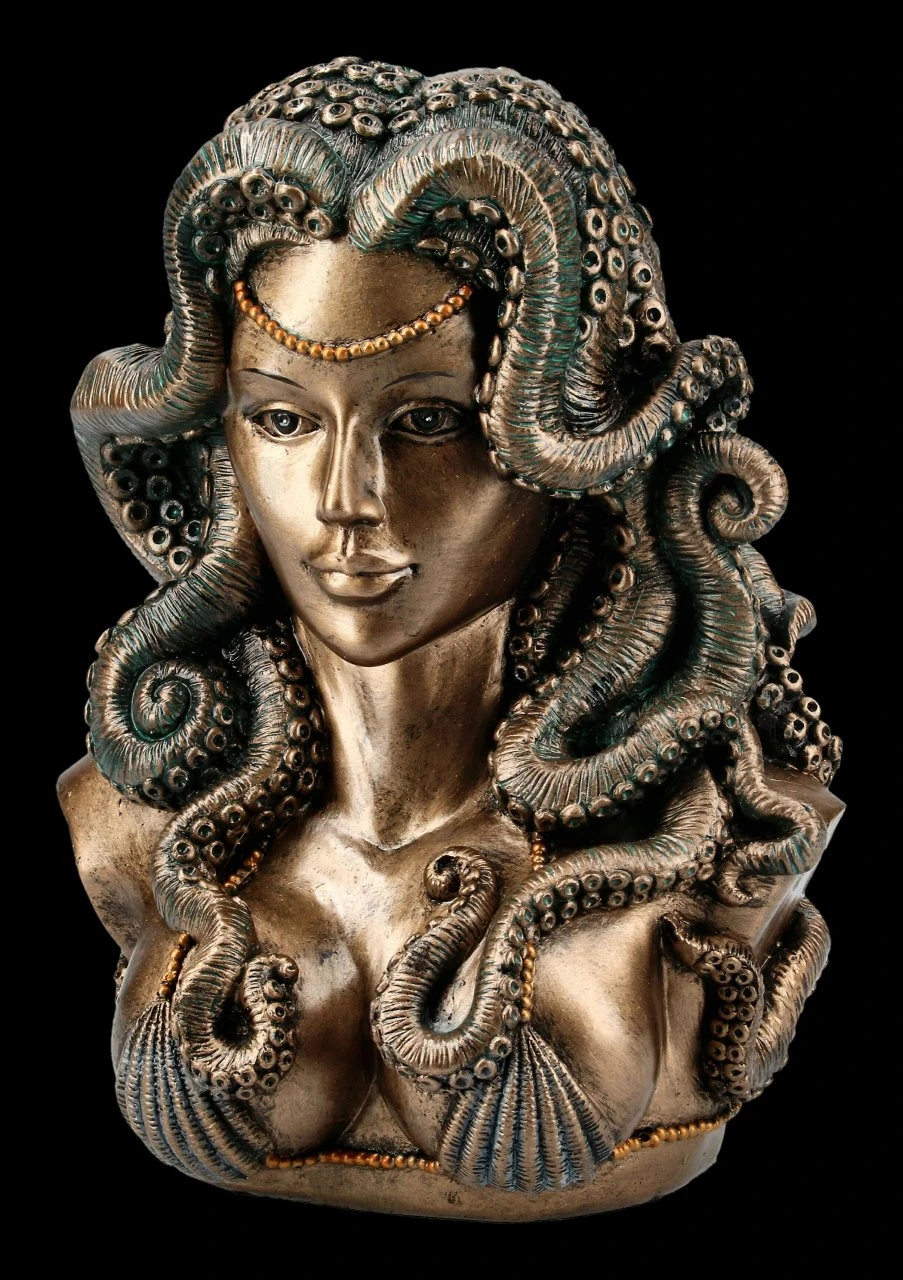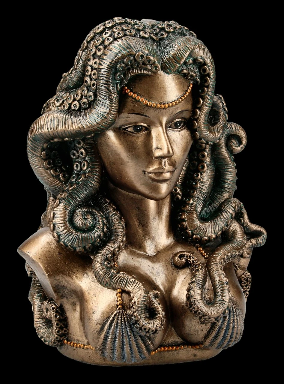 Fast wie aus der Zeit des Jugendstil wirkt diese unglaublich anmutige Büste der Meereshexe Cecaelia. Ein Octopus bildet mit seinen acht Beinen die Haarpracht der tollen Hexen Figur. Sehr detailreich aus bronziertem und coloriertem Kunststein (Polyresin) gefertigt, wird die wunderschöne Büste in Ihrem Zuhause ein tolles, ästhetisches Dekoelement. Aber auch in Ihrem Arbeitsbereich wird Cecaelia mit der Höhe von 20,5 cm, der Breite von 15,5 cm und der Tiefe von 13 cm viele bewundernde Blicke auf sich ziehen.
