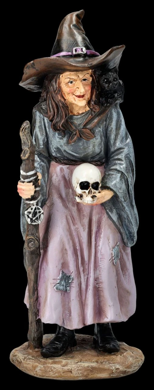 Magische Hexenfigur mit Schwarzer Katze und Mystischem Schädel