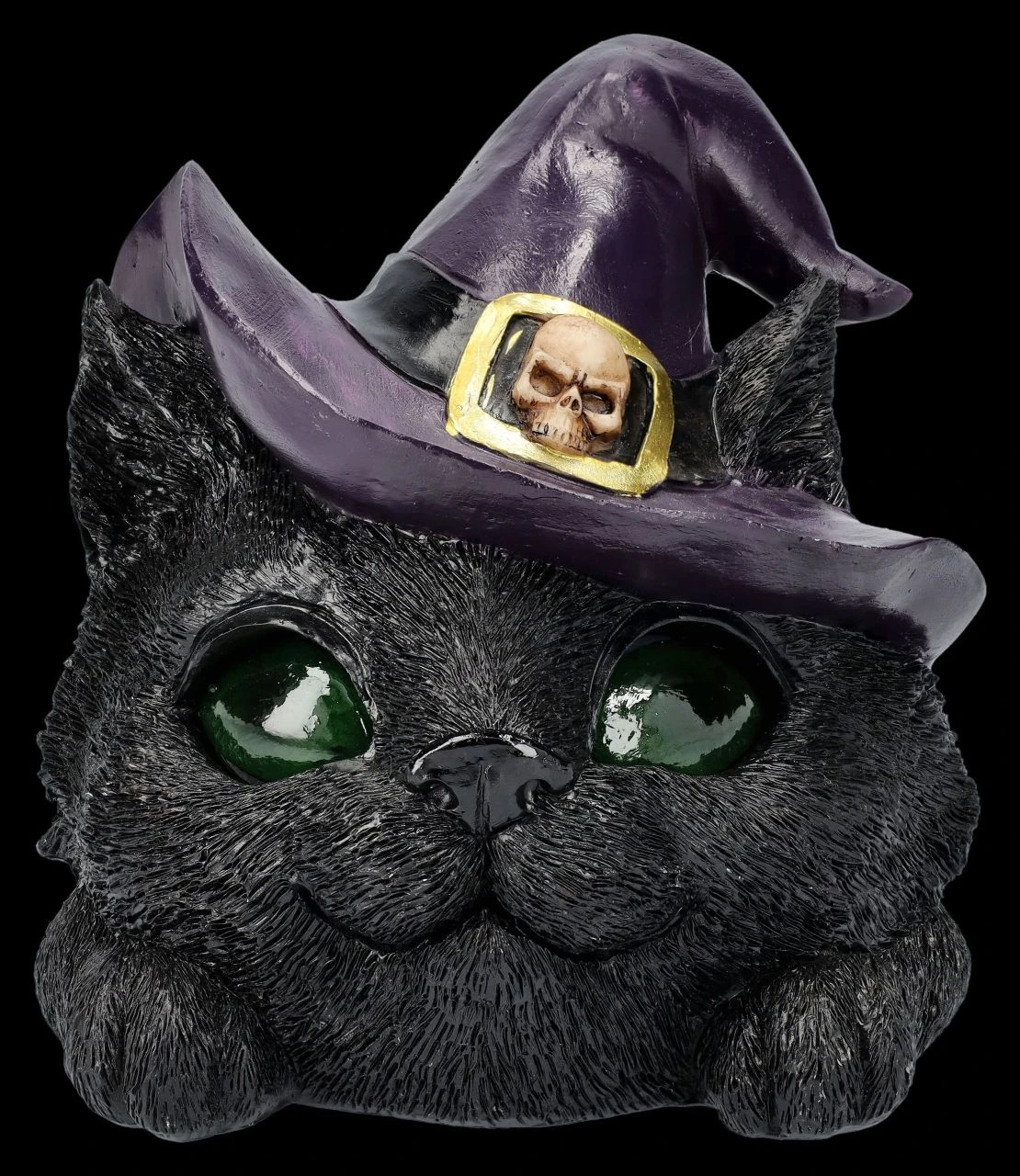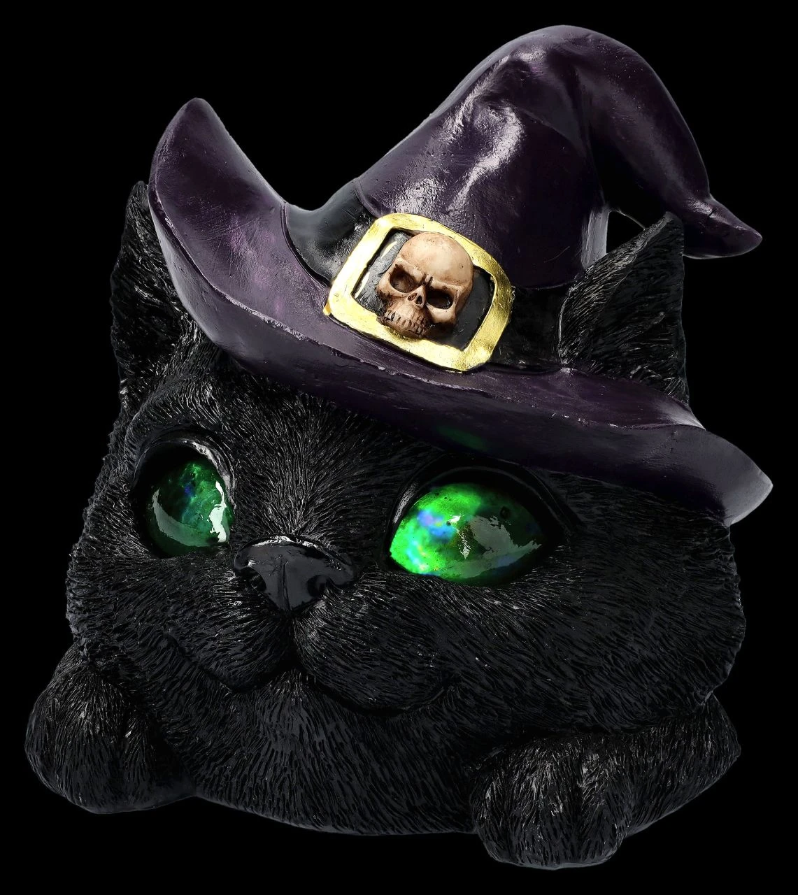 Nicht nur der Hexenhut mit dem Schädel-Emblem zeigt, wem die schwarze Katze gehört. Auch die grün leuchtenden Augen in der Dunkelheit beweisen, dass es der Kopf einer Hexenkatze ist, der hier so harmlos liegt. Die 14 cm hohe, 13 cm breite und 14 cm tiefe Figur mit dem Hexenkatzen-Kopf ist aus handbemaltem Kunststein (Polyresin). Durch die batteriebetriebene LED-Beleuchtung mit Farbwechsler wirken die Augen sehr mystisch. Für die LED-Beleuchtung werden 2 x AA Batterien benötigt, die jedoch nicht in der Lieferung enthalten sind. Familiar Grin, die Figur mit dem Hexenkatzen-Kopf, ist vor allem an Halloween eine perfekte Deko.