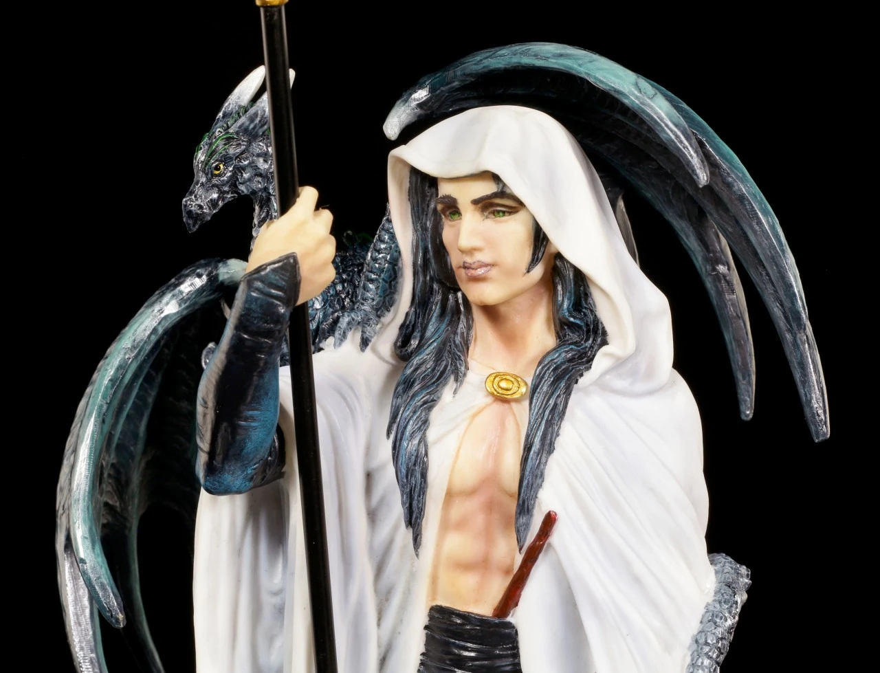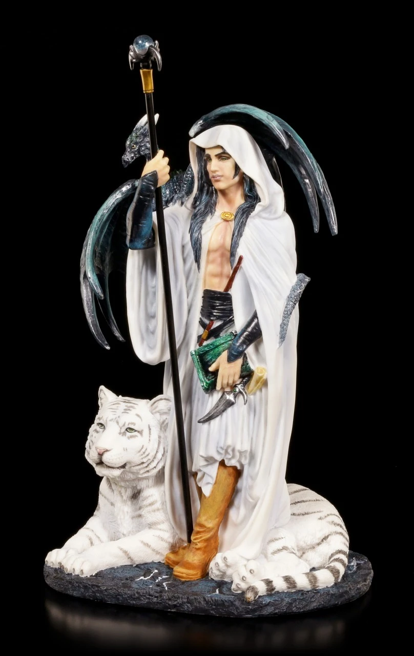 Die wundervolle Zauberer Figur Arcana the Magi von Ruth Thompson repräsentiert die Insignien der Magier. Der Zauberstab, das Zauberbuch, der magische Umhang, der magische Begleiter in Form des Drachen und der tierische Begleiter – der weiße Tiger, alle sind versammelt und ergeben so das Gesamtbild der Magie.