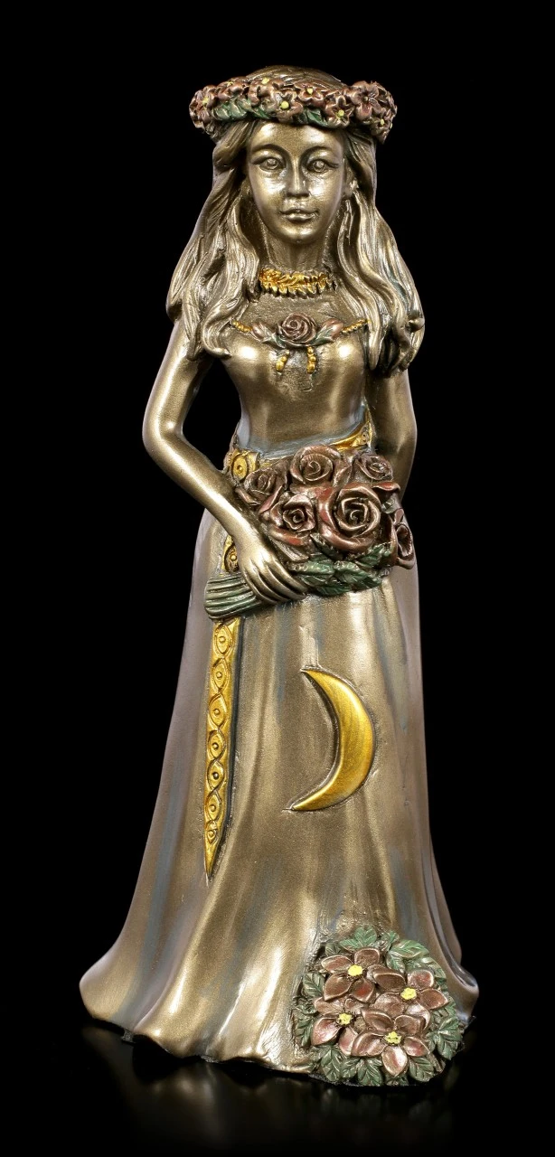 Die Jungfrau gilt in der keltischen Mythologie als eine Erscheinungsform der Dreifaltigen Göttin. Die Jungfrau verkörpert den Anfang des Lebens und die Jugend dar. Sie strebt nach Liebe. Sie wird oft mit einem Blumenkranz auf dem Kopf und mit Blumen in der Hand abgebildet. Die wunderschön bronzierte und colorierte keltische Göttin aus Kunststein (Polyresin) glänzt sanft im Licht und bringt so die keltische Mystik in Ihre Zimmerdekoration.