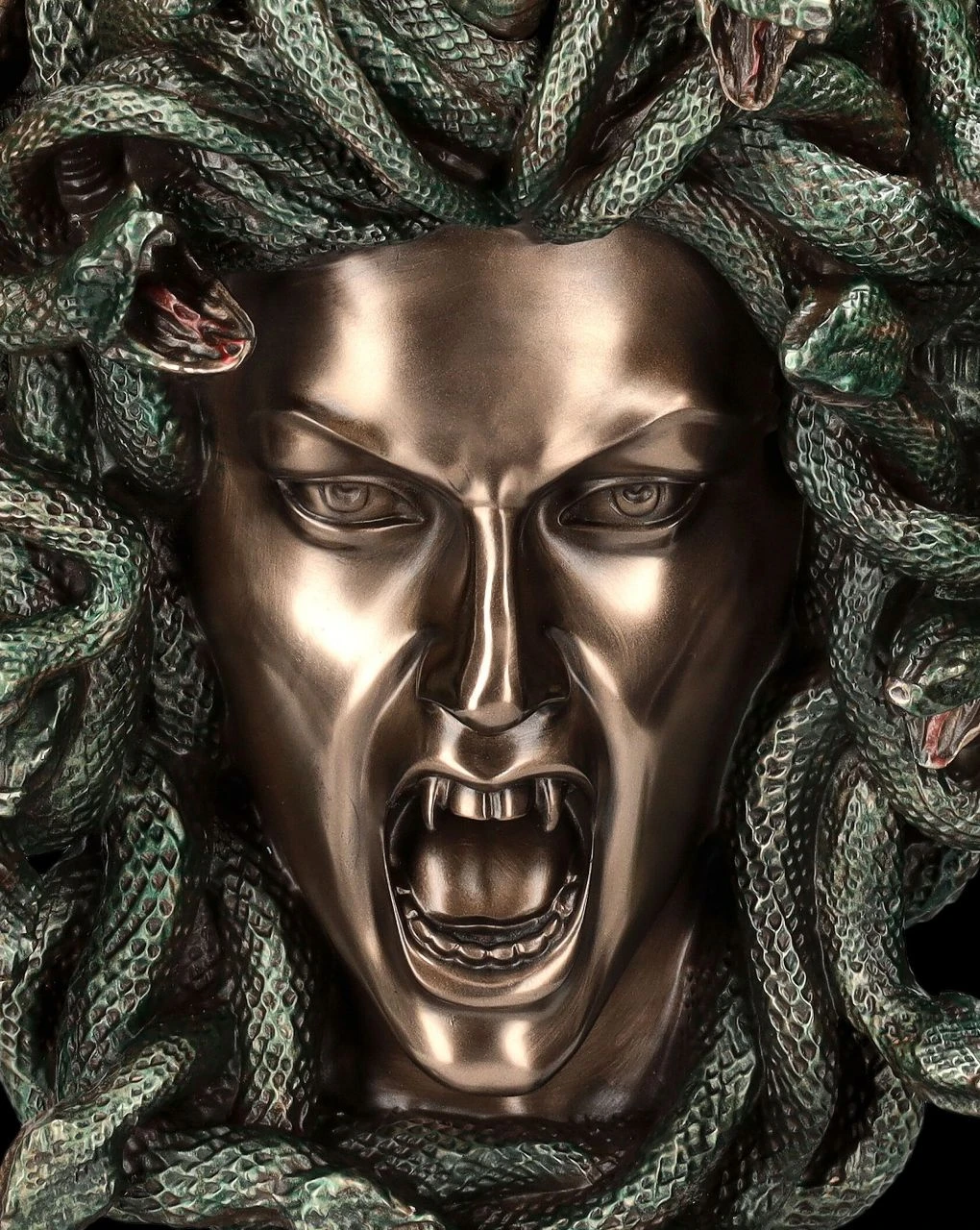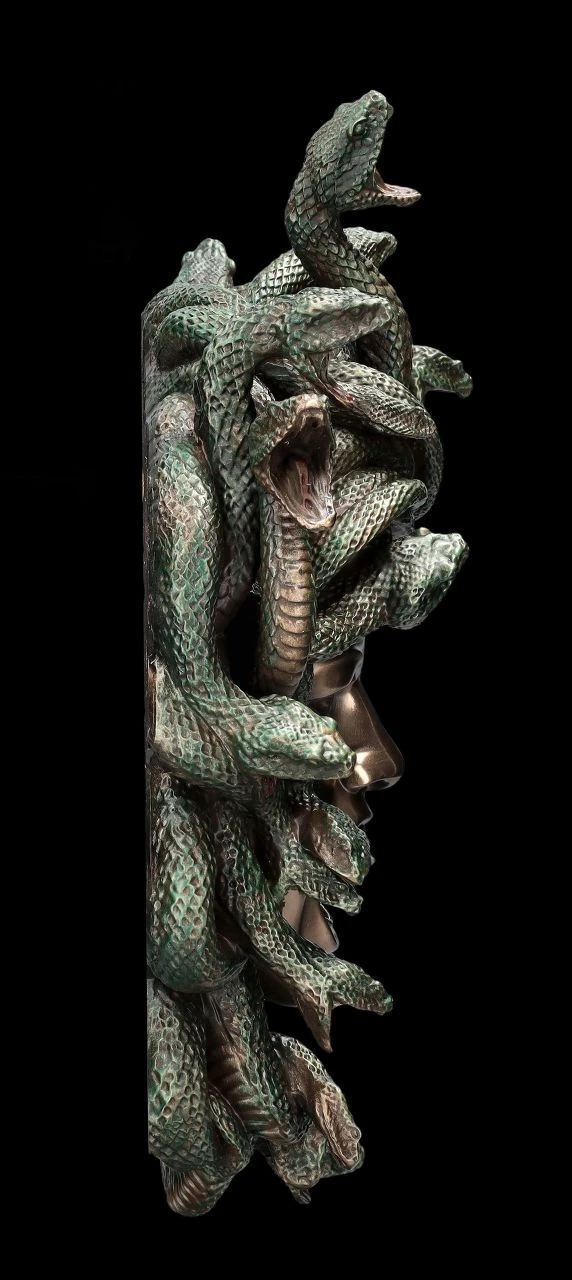 In der griechischen Mythologie wurde die junge und ursprünglich außerordentlich schöne Medusa aus Eifersucht von Athene verflucht und in ein schreckliches und abschreckendes Ungeheuer mit Schlangenhaaren verwandelt, das jeden zu Stein erstarren ließ der sie erblickte. Sie war aber die einzige der drei Gorgonen-Schwestern, die sterblich war und so konnte sie von Perseus besiegt und enthauptet werden. Dazu hatte Perseues von Athene deren glänzendes, bronzenes Schild erhalten, das er Medusa vorhielt, so dass sie selbst erstarrte. Medusas Kopf brachte Perseus zu Athene, deren Rache an der einst schönen Medusa nun vollkommen war. Das Medusa Wandrelief zum Hängen aus der Studio Collection von Veronese wurde detailreich und sorgfältig aus edel bronziertem und coloriertem Kunststein (Polyresin) geschaffen. Mit der Höhe von 29 cm, der Breite von 22 cm und der Tiefe von 8,5 cm wird dieses fantastische Wandrelief zum Highlight an der Wand. Am besten ist, Sie hängen gegenüber einen Spiegel auf, damit Sie sich selbst vor den Blicken der Medusa schützen, die jedoch unliebsame Besucher abhalten könnten.