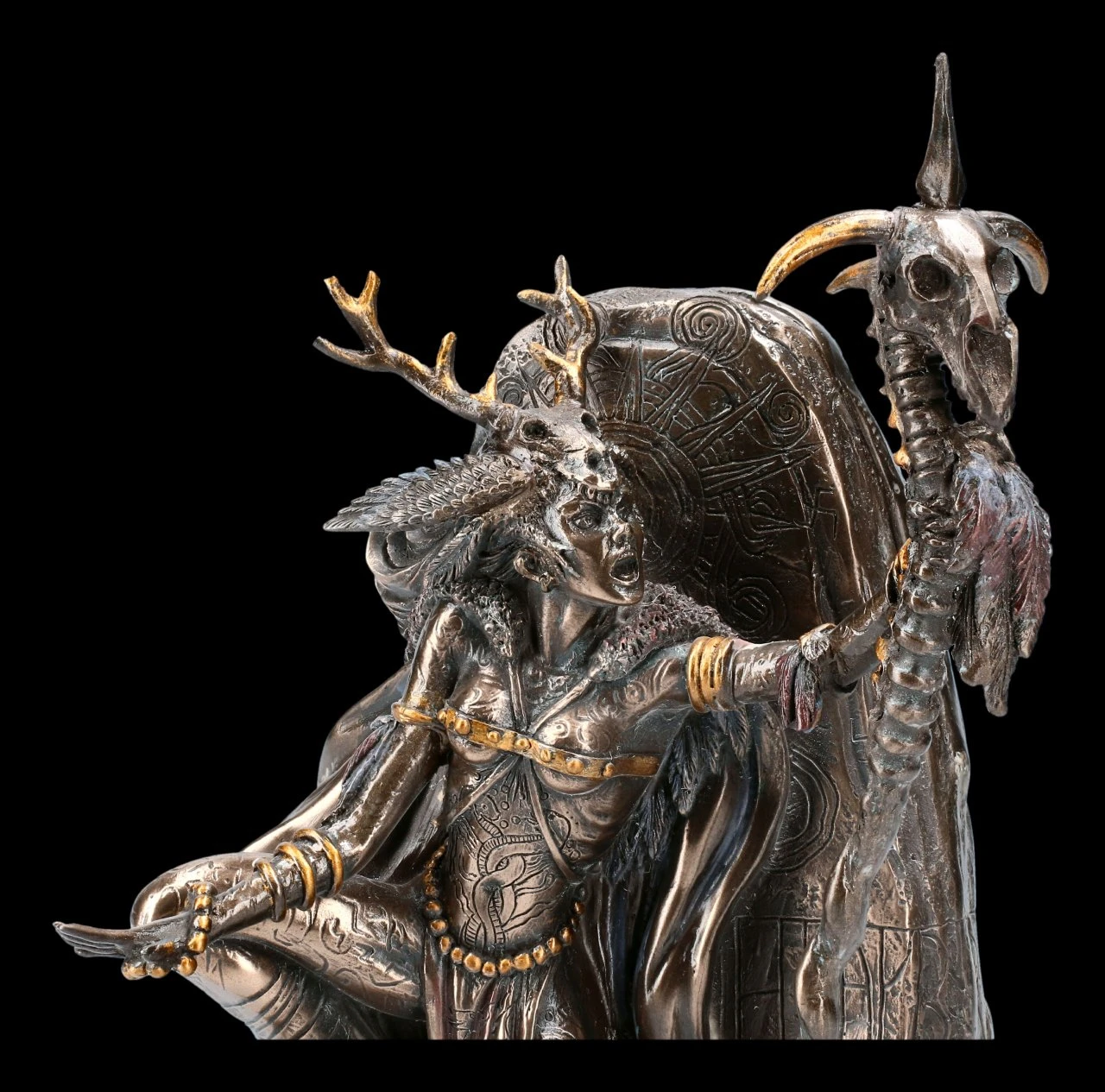 Die Figur Moran le Fay von Derek W Frost besticht durch die vielen kleinen und hervorragend ausgearbeiteten Details. Die Figur wurde aus hochwertigem Kunststein gegossen und anschließend bonziert und koloriert. So wirde die Figur garantiert zu dem Blickpunkt einer Sammlung. Morgan le Fay war die Halbschwester von König Artus. Sie gilt als Heilerin und auch als ernstzunehmende Gegnerin von Artus.