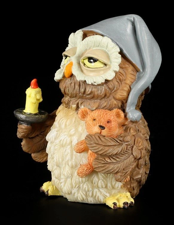 Schlaftrunken blickt die Eule aus fast geschlossenen Augen hervor. Sie trägt noch ihre Schlafmütze und freut sich bestimmt, wenn sie wieder schlafen gehen kann.