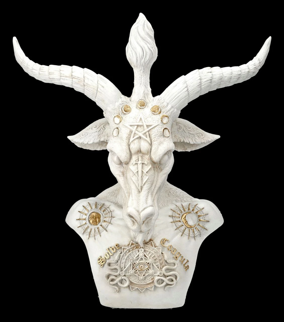 Faszinierend und edel ist diese weiße Büste des Baphomet mit den wenigen goldenen Akzenten in den zahlreichen Symbolen.‘ Löse und verbinde‘ – also füge es zu einem anderen Ganzen wieder zusammen – bedeutet die alchemistische Formel ‚Solve et coagula‘ über den Freimaurer-Symbolen auf der Brust der okkulten Baphomet-Figur mit dem Pentagramm auf der Stirn. Aber auch die Symbole der Zwillingsbrüder Cautes und Cautopates aus dem Mitraskult, wie der Morgen durch die Sonne und der Abend durch den Mond auf den Schulterblättern der Baphomet Büste lassen viele Deutungen zu. Schließlich vereint Baphomet Frau und Mann, Gut und Böse, Mensch und Dämon, Mensch und Tier. So ist es nicht verwunderlich, dass die Symbole aus allen alten Kulturen bekannt sind. Die schöne Baphomet Büste von Nemesis Now aus handbemaltem und detailreich gefertigtem Kunststein (Polyresin) mit der Höhe von 34 cm, der Breite von 30,5 cm und der Tiefe von 15 cm ist in ihrer zurückhaltenden Form- und Farbgebung ein magischer Blickfang